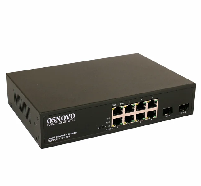 PoE Коммутатор OSNOVO SW-80802(150W) PoE коммутатор Gigabit Ethernet на 8 RJ45 + 2 SFP порта. Порты: 1 x GE (10/100/1000Base-T) с PoE (до 60W, A+B) + 7 x GE (10/100/1000Base-T) с PoE (до 30W), 2 x GE SFP (1000 Base-В наличии