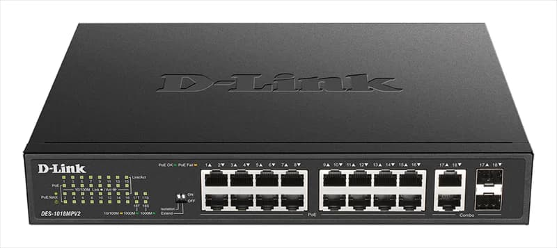 Коммутатор D-Link Коммутатор, 8x2.5GBase-T PoE 802.3bt 90 Вт, PoE-бюджет 230 Вт, корпус металлDMS-108P/A1A· D-LinkВ наличииВойти для цены- Коммутатор D-Link Конфигурируемый PoE-коммутатор, 16х1000Base-T PoE, 2x1000Base-X SFP, PoE-бюджет 240 Вт, дальность PoE до 250 м, DIP-переключатель, корпус металлDGS-1018P/B1A· D-LinkВ наличииВойти для цены