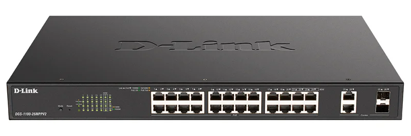 Коммутатор D-Link Настраиваемый L2 PoE-коммутатор, 24х1000Base-T PoE (4 порта 802.3bt 90 Вт), 2xCombo 1000Base-T/SFP, PoE-бюджет 525 ВтDGS-1100-26MPPV2/A3A· D-LinkВ наличииВойти для цены