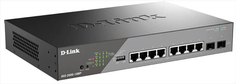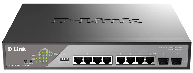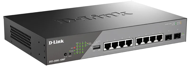 Коммутатор D-Link Настраиваемый L2 PoE-коммутатор, 8x1000Base-T PoE 802.3bt 90 Вт, 2x1000Base-X SFP, PoE-бюджет 242 Вт, дальность PoE до 250 мDSS-200G-10MPP/A1A· D-LinkВ наличииВойти для цены