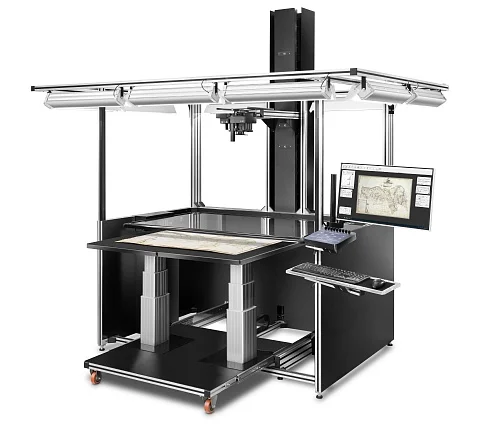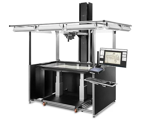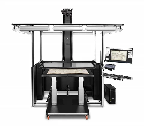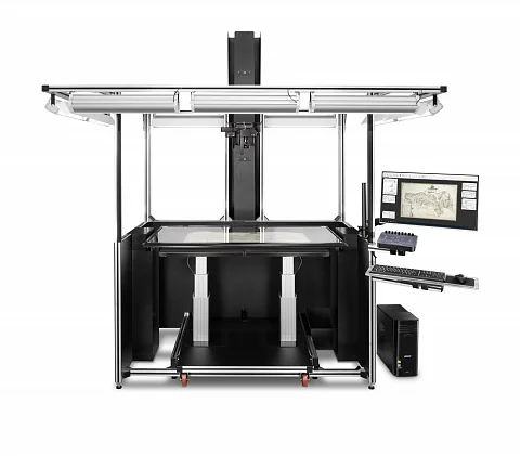 Универсальный автономный комплекс высококачественного сканирования (КВС) ЭларСкан А0 Формат до А0+, цветность 48/24 бит, моторизованная книжная колыбель с прижимным стеклом для оригиналов весом до 50 кг и толщиной 35 см (до 75 см без прижимного стекла)