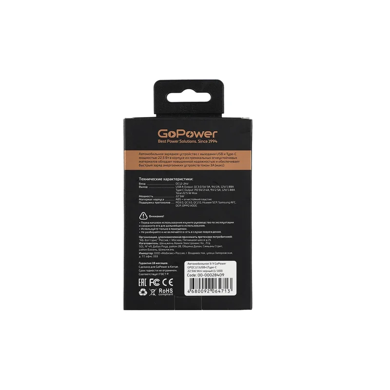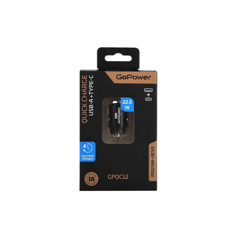 Автомобильное З/У GoPower GPQC12 1USB+1Type-C 22.5W Mini