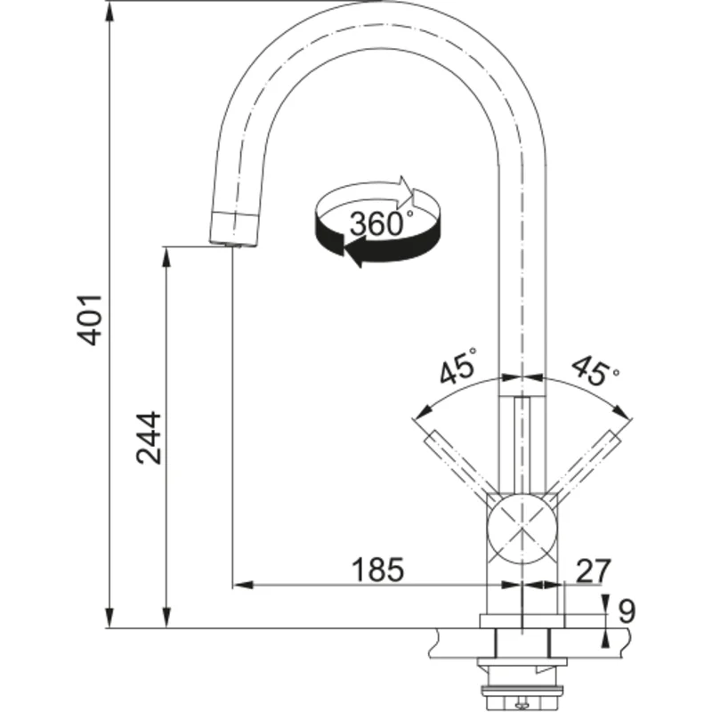 Смеситель имеет поворотный механизм на 360°, что позволяет легко направлять поток воды в любую часть мойки. Это особенно удобно при мытье крупной посуды или использовании нескольких чаш мойки.