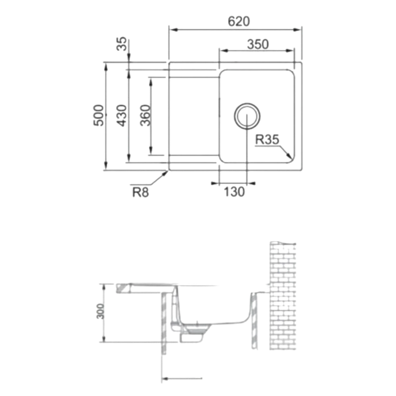 Габариты мойки — 620×500 мм, а размеры чаши — 430×350 мм с глубиной 180 мм, что обеспечивает достаточно места для комфортного мытья посуды. Такие размеры делают мойку универсальной для большинства кухонных гарнитуров.