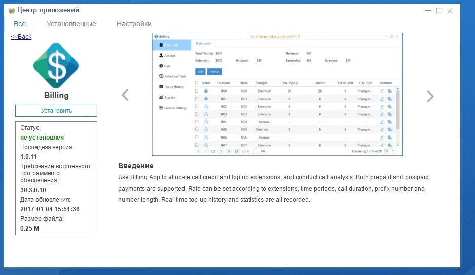 Приложение устанавливается в App-центре Yeastar в интерфейсе самой телефонной станции. Доступны 30-дневный пробный период и возможность покупки бессрочной лицензии.