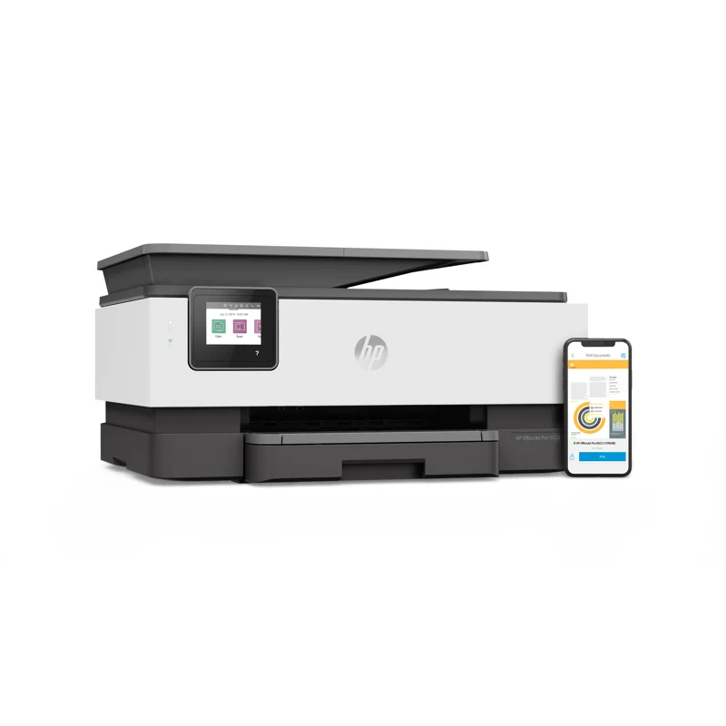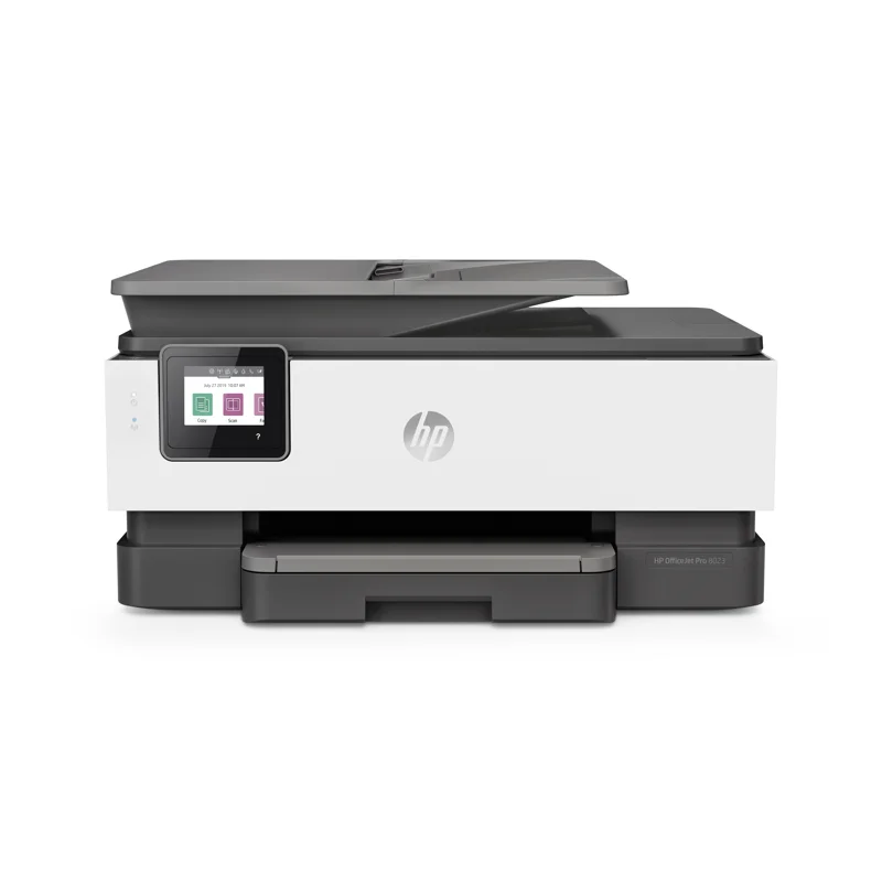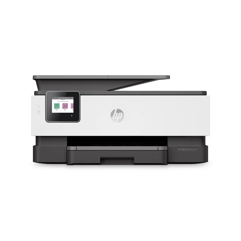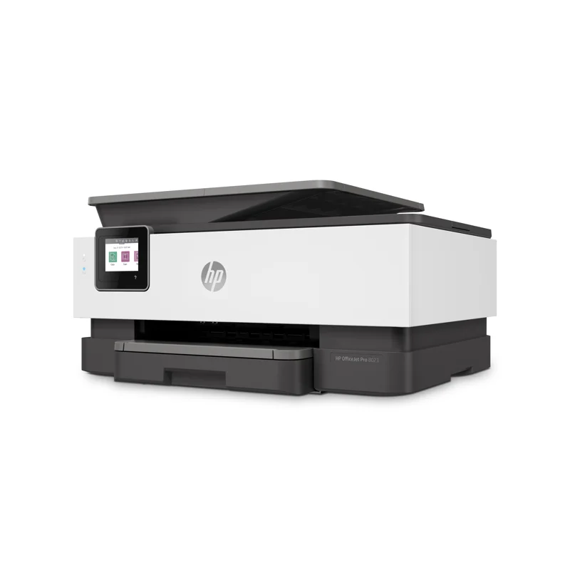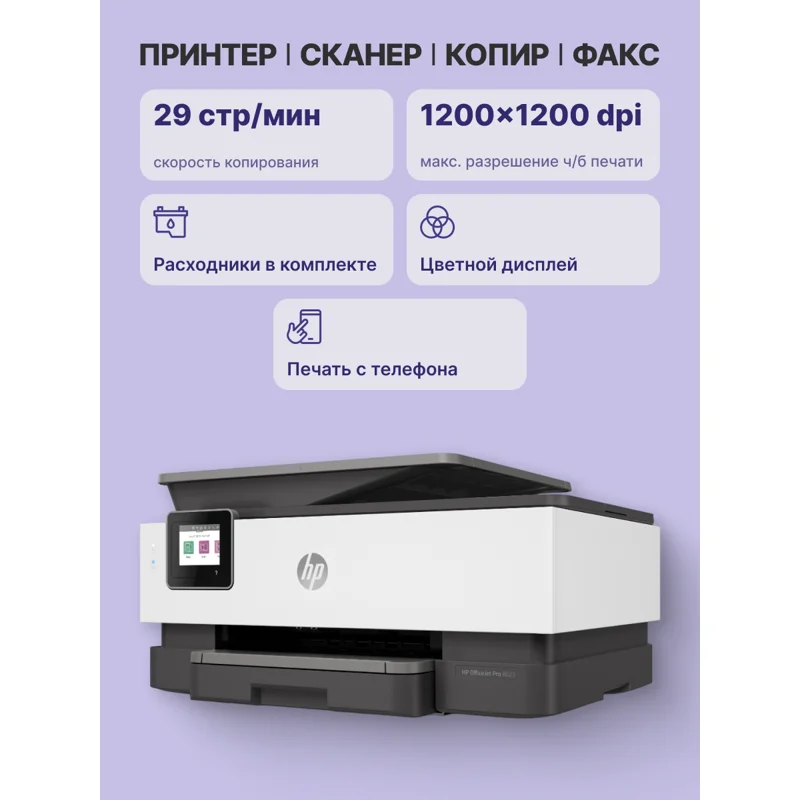 МФУ струйное HP OfficeJet Pro 8023 – настольное устройство, которое используется в качестве копира, факса, принтера или сканера. Предназначается для установки в офисах. Термоструйная цветная печать производится на формате А4 с максимальной скоростью 10 стр/мин в разрешении 4800x1200 dpi. Черно-белая печать производится в разрешении 1200x1200 dpi со скоростью 20 стр/мин. Сканер планшетный/протяжный, может сканировать документы непосредственно на ПК со скоростью 8 стр/мин. Скорость копирования документов составляет 13 стр/мин. Факс может печатать файлы в черно-белом и в цветном формате. Для работы МФУ струйное HP OfficeJet Pro 8023 задействует 4 картриджа. Поддерживаются мобильные технологии печать Wi-Fi Direct, Mopria, AirPrint. Частота процессора составляет 1200 МГц, а системная память имеет объем 256 МБ. При активном использовании потребляется 21 Вт мощности.