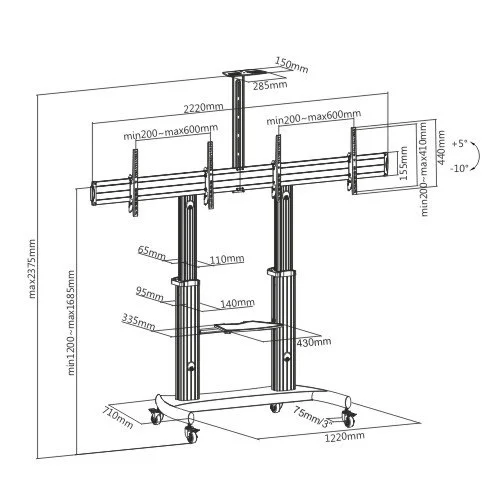 Предназначена для двух ТВ-панелей с диагональю 37-60". Имеет регулировки по высоте и наклону, кабель-каналы и 2 полки для крепления камеры и видеотерминала. Цвет – серебристый, материал – алюминий.