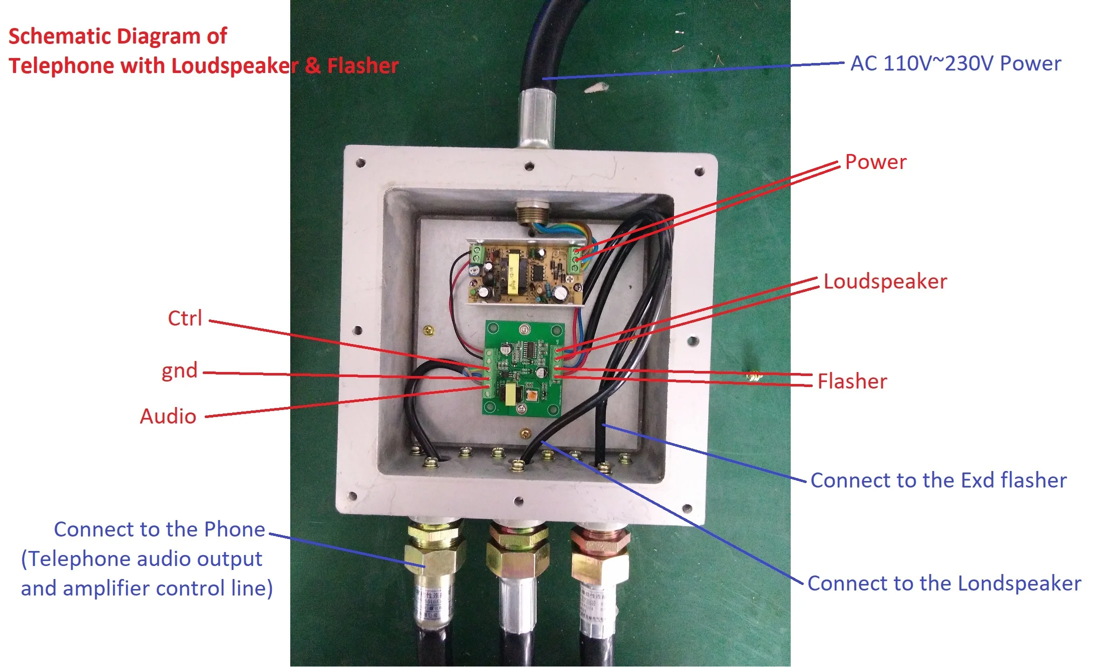 Всепогодный взрывозащищенный промышленный SIP-телефон в комплекте с взрывозащищенными горном и проблесковым маяком. Изготовлен из литого под давлением алюминия с антикоррозионным эпоксидным порошковым покрытием и имеет степень защиты от окружающей среды IP67. Рекомендован для использования в метро, горнодобывающей промышленности, шахтах с вероятностью появления взрывоопасных газов, нефтедобывающих предприятиях, тоннелях, заводах, электростанциях, предприятиях с большим количеством взвесей в воздухе (изготовление продуктов из муки и сухого молока) и т. д.