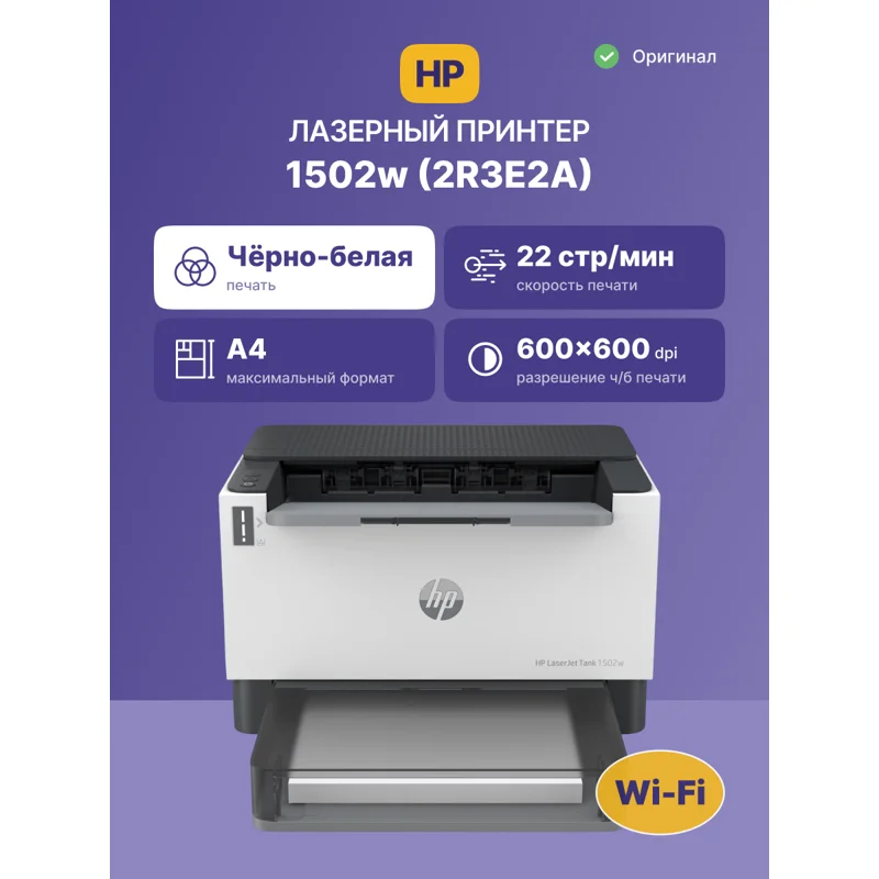 Принтер HP LaserJet Tank 1502w. Принтер HP LaserJet Tank 1502w, предварительно заправленный оригинальным тонером HP для печати до 5000 страниц, помогает сокращать затраты на печать и расширяет возможности вашего предприятия. Высококачественная печать со сверхнизкой стоимостью отпечатка. Предварительная заправка тонером HP для печати до 5000 страниц позволяет сократить эксплуатационные расходы. Снижайте стоимость отпечатка благодаря заправочному комплекту с тонером HP. Простая заправка оригинальным тонером HP всего за 15 секунд. Сокращайте время простоя и пополняйте тонер всего за 15 секунд благодаря комплектам для заправки тонером HP сверхвысокой емкости. Полный набор функций для вашего бизнеса. Работайте эффективнее благодаря высокой скорости печати, барабану переноса изображений с ресурсом 50 000 страниц, системе безопасности HP Wolf Essential Security и приложению HP Smart. Заправочный комплект сверхвысокой емкости с тонером HP. С легкостью справляйтесь с большими объемами печати и реже прерывайтесь на заправку благодаря заправочным комплектам с тонером HP, ресурс которых рассчитан на печать 2500 и 5000 страниц. Двухдиапазонный адаптер Wi-Fi с функцией самовосстановления. Более быстрое и надежное подключение благодаря двухдиапазонному адаптеру Wi-Fi с функцией самовосстановления. Приложение HP Smart. Печать, сканирование и копирование прямо с вашего телефона - где бы вы ни находились. Качество лазерной печати без компромиссов. Получайте отпечатки неизменно высокого качества с четким текстом и насыщенным черным цветом на своем принтере Laser Tank.