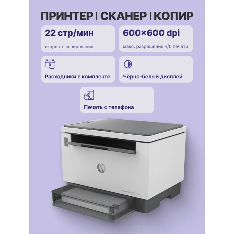 Лазерное МФУ HP LaserJet Tank MFP 1602w 2R3E8A с разрешением печати встроенного копира 600х600 т/д монохромного типа обеспечивает производительность до 25000 стр/мес.