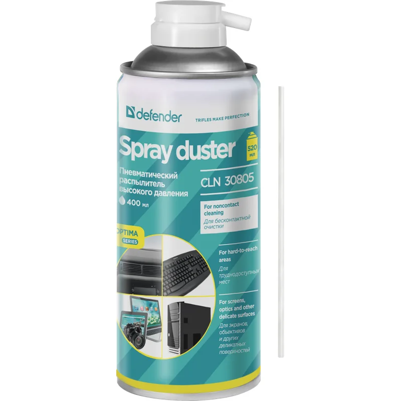 Пневматический распылитель Defender CLN 30805 Optima. Для очистки труднодоступных мест корпусов компьютеров, клавиатур и офисной техники, а также удаления пыли с линз оптических приборов, экранов мониторов и других поверхностей. - Экономичное расходование. - Для бесконтактной очистки для ухода за электронным и радиотехническим оборудованием и компонентами, компьютерами, ноутбуками, клавиатурами, принтерами, микроскопами. - Для деликатных поверхностей, в том числе для оптических линз. - Для труднодоступных мест. - Для экранов, объективов и других деликатных поверхностей. - Использовать только для выключенных приборов. - Аккуратно удалите пластиковый предохранитель, вставьте прилагаемую в комплекте трубочку в распылительную головку. Очистку производить короткими нажатиями, не наклоняя баллон более, чем на 30°! - Баллон держать строго вертикально. Перед началом использования проверить, направив его в сторону. - При длительном нажатии на распылительную головку баллона происходит его охлаждение и падение давления внутри баллона. - Не рекомендуется нажимать на головку цилиндра непрерывно во избежание его замерзания и снижения мощности струи при распылении. - Не нагревать. Запрещается нагревать баллон принудительно! При температуре нагрева баллона свыше 50°C может произойти взрыв. - Хранить в сухом вентилируемом месте при температуре от -20°С до +30°С на расстоянии не менее 1 м от нагревательных приборов, отдельно от пищевых продуктов. Размеры без упаковки: 6.50x18.50x6.50 см. Масса без упаковки: 0.31 кг. Размеры индивидуальной упаковки: 6.50x18.50x6.50 см. Масса индивидуальной упаковки: 0.31 кг. Номинальный объем: 400 мл. Объем баллона: 520 мл. Температура разгерметизации баллона: 50°С. Время использования баллона до его полного охлаждения при непрерывном использовании: 45 с. Время использования баллона до его полного охлаждения при использовании в течение 3 с с перерывом 3 с после каждого использования: 80 с.
