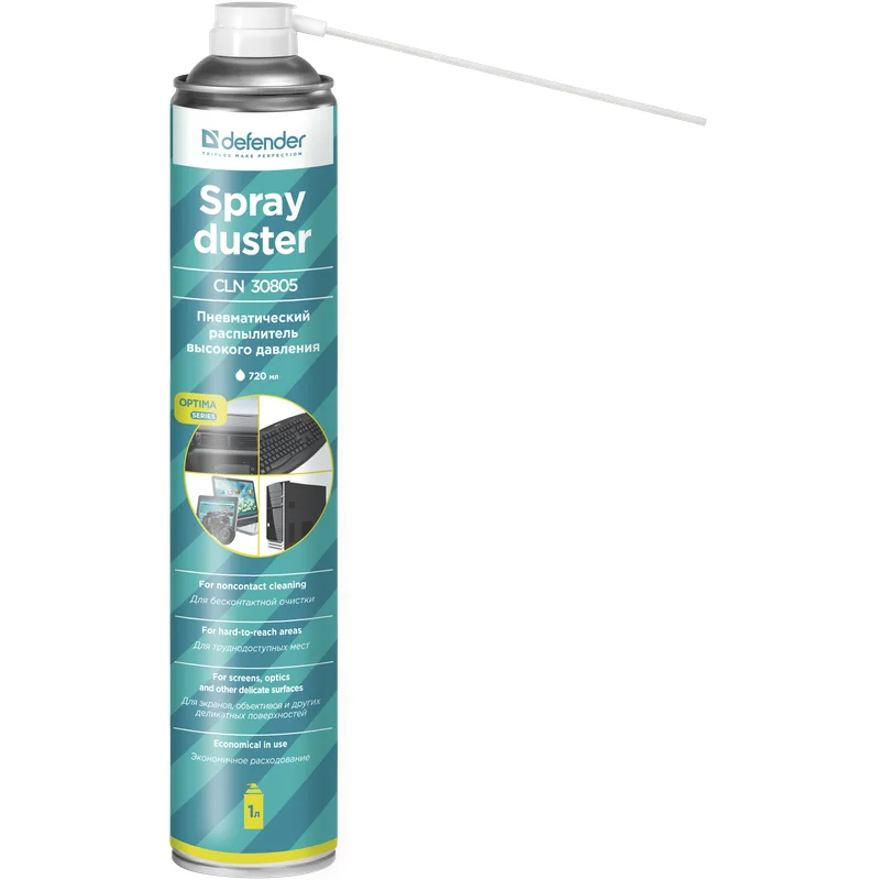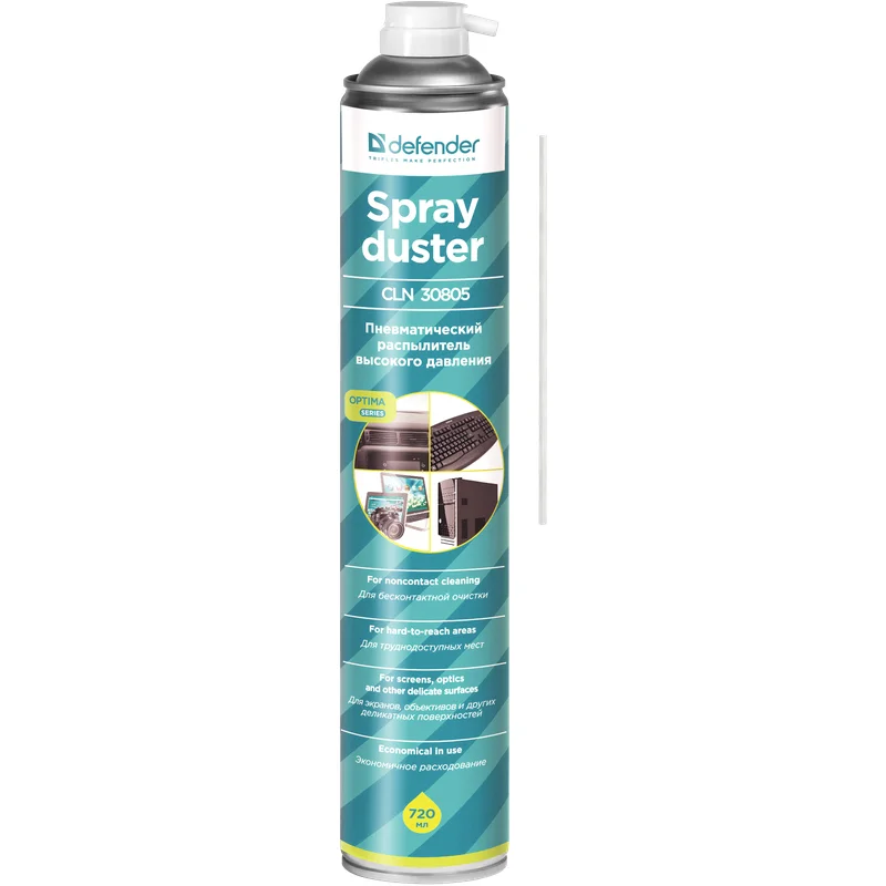Пневматический распылитель Defender CLN 30805 Optima. Двойной объем газа в одном баллоне для очистки в 2 раза больше корпусов компьютеров, ноутбуков, клавиатур, а также удаления загрязнения и пыли с линз оптических приборов, экранов мониторов и других поверхностей. - Экономичное расходование. - Для бесконтактной очистки для ухода за электронным и радиотехническим оборудованием и компонентами, компьютерами, ноутбуками, клавиатурами, принтерами, микроскопами. - Для деликатных поверхностей, в том числе для оптических линз. - Для труднодоступных мест. - Для экранов, объективов и других деликатных поверхностей. - Использовать только для выключенных приборов. - Аккуратно удалите пластиковый предохранитель, вставьте прилагаемую в комплекте трубочку в распылительную головку. Очистку производить короткими нажатиями, не наклоняя баллон более, чем на 30°! - Баллон держать строго вертикально. Перед началом использования проверить, направив его в сторону. - При длительном нажатии на распылительную головку баллона происходит его охлаждение и падение давления внутри баллона. - Не рекомендуется нажимать на головку цилиндра непрерывно во избежание его замерзания и снижения мощности струи при распылении. - Не нагревать. Запрещается нагревать баллон принудительно! При температуре нагрева баллона свыше 50°C может произойти взрыв. - Не допускается единовременное расходование всего содержимого баллона в закрытых помещениях объемом менее 10 м³. - Хранить в сухом вентилируемом месте при температуре от -20°С до +30°С на расстоянии не менее 1 м от нагревательных приборов, отдельно от пищевых продуктов. Размеры без упаковки: 6.70x32.80x6.70 см. Масса без упаковки: 0.54 кг. Размеры индивидуальной упаковки: 6.70x32.80x6.70 см. Масса индивидуальной упаковки: 0.54 кг. Номинальный объем: 720 мл. Объем баллона: 1000 мл. Температура разгерметизации баллона: 50°С.
