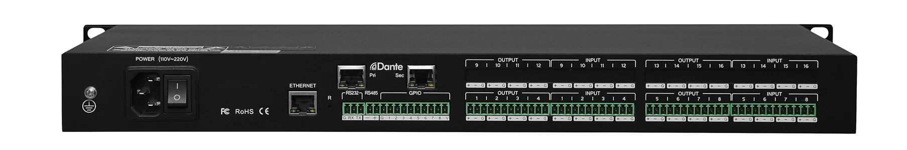 Высокопроизводительный и технологический интегрированный цифровой аудио процессор с 8 входными каналами и 8 выходными, Встроенный ДСП аудио для того чтобы обеспечить потребителей превосходным качеством звука; с встроенным подавителем обратной связи, подавлением эха, устранением шума, передачей по сети Данте и другими функциями для достижения высококачественного звука. Он главным образом используется в помещениях большого и среднего размера, для того чтобы соответствовать множественным прикладным требованиям для: видеоконференции, стадиона, конференц-зала, аудитории, банкетного зала, выставочного зала, конференции мультимедиа, центра управления и других общественных звуковых системах.