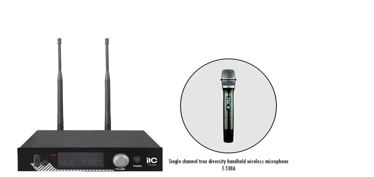 ITC T-530A Одноканальная радиомикрофонная система диапазона UHF, приёмник с LCD дисплеем + 1 высококачественный ручной микрофон-передатчик.