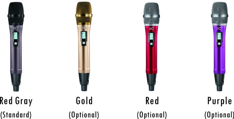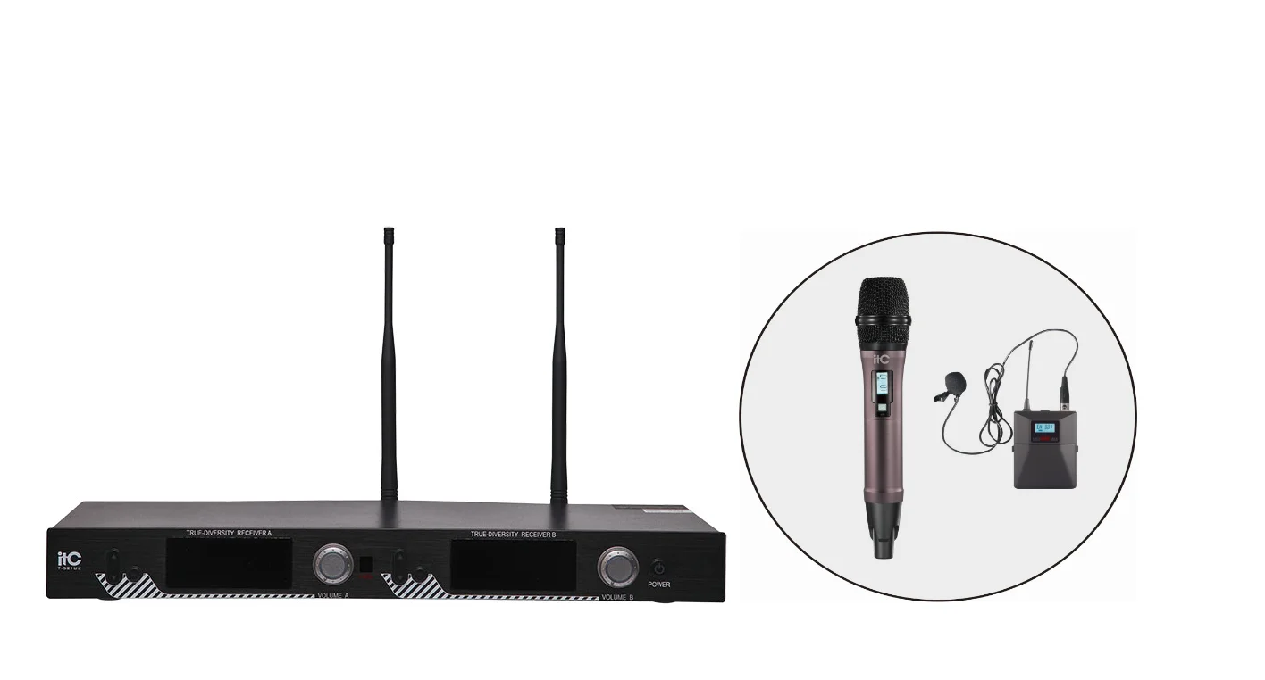 ITC T-521UT Двухканальная радиомикрофонная система UHF диапазона, приёмник + два высококачественных микрофона - один петличный микрофон + один ручной микрофон, стандартный цвет серый (золотой, красный и пурпурный цвета - за дополнительную плату).