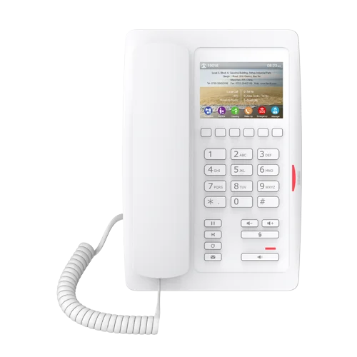 Fanvil H5 — это высококачественный гостиничный SIP-телефон с простым понятным интерфейсом и поддержкой PoE. Устройство соответствует международным стандартам и обладает полным набором необходимых функций. Старшая модель линейки оснащена 6 программируемыми кнопками и 3,5' LCD-экраном, на который заносятся установленные на каждую из кнопок действия без использования бумажных носителей. Поддержка нескольких языков в таком случае важна для международных отелей. Модель оснащена USB-портом для зарядки мобильных телефонов и других устройств. Все это делает Fanvil H5 идеальным решением для гостиниц высокого класса и для номеров класса Lux в любых отелях.