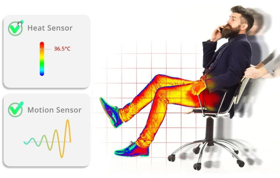 Датчик тепла и движения для обнаружения теплового излучения и движения объекта. AC-610 имеет встроенный алгоритм, который точно распознает, занят ли объект, проходит ли человек мимо или сидит за столом. Устанавливается под столом и направлен на стул.