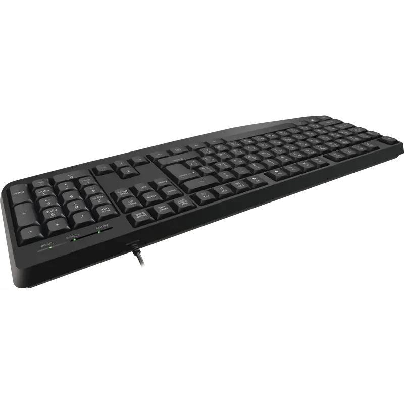 Устройство имеет 104 стандартные клавиши, что делает ее привычным инструментом для набора текста и выполнения повседневных задач. Корпус выполнен из прочного ABS-пластика, наличие внутренних и внешних ребер жесткости существенно повышает устойчивость к механическим нагрузкам. Дополнительную устойчивость на гладких поверхностях обеспечивают резиновые ножки.