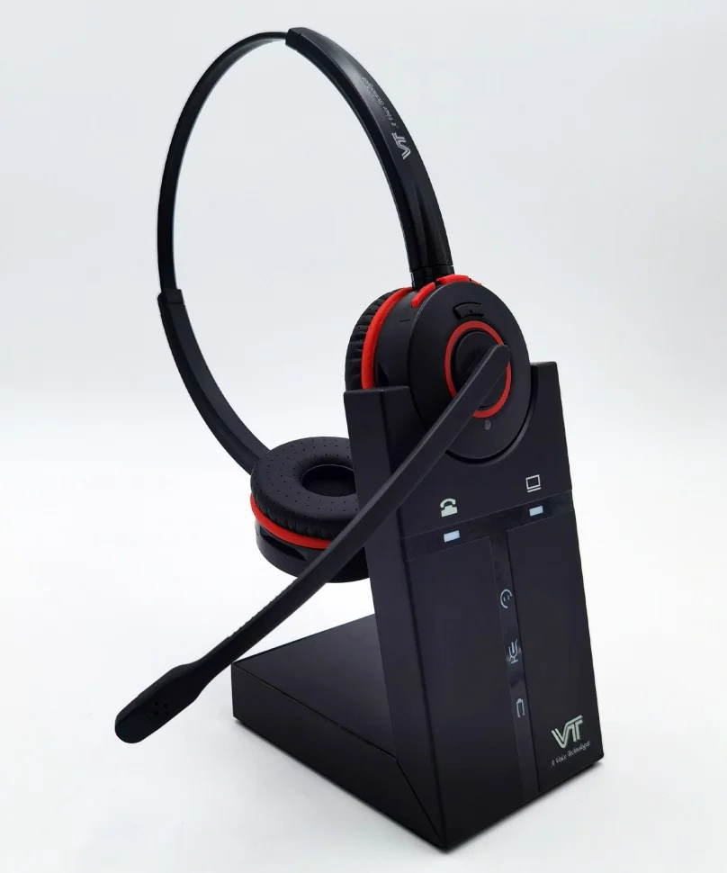 VT9400-D - беспроводная бинауральная DECT-гарнитура с HD-звуком. Базовая станция DECT совмещена с зарядным устройством. Данную гарнитуру легко можно подключить к любому телефону через аналоговый разъём RJ9 (в комплекте кабель типа 3 для подключения к телефонам Yealink, Grandstream, Snom; для подключения к другим телефонам необходимо приобрести соответствующий кабель-переходник) и к ПК/Ноутбуку или телефонному аппарату через USB (type-A).