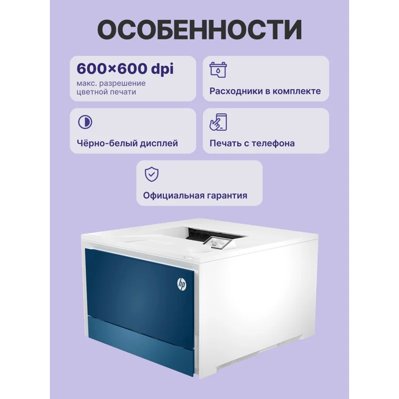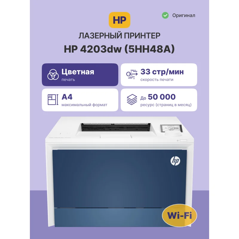 Лазерный цветной принтер HP Color LaserJet Pro 4203dw Printer (A4,600x600dpi,33ppm,512Mb,Duplex, 2trays 50+250,USB 2.0/GigEth/WiFi/Bluetooth/AirPrint, 4Ctgs in box, repl.W1Y45A)