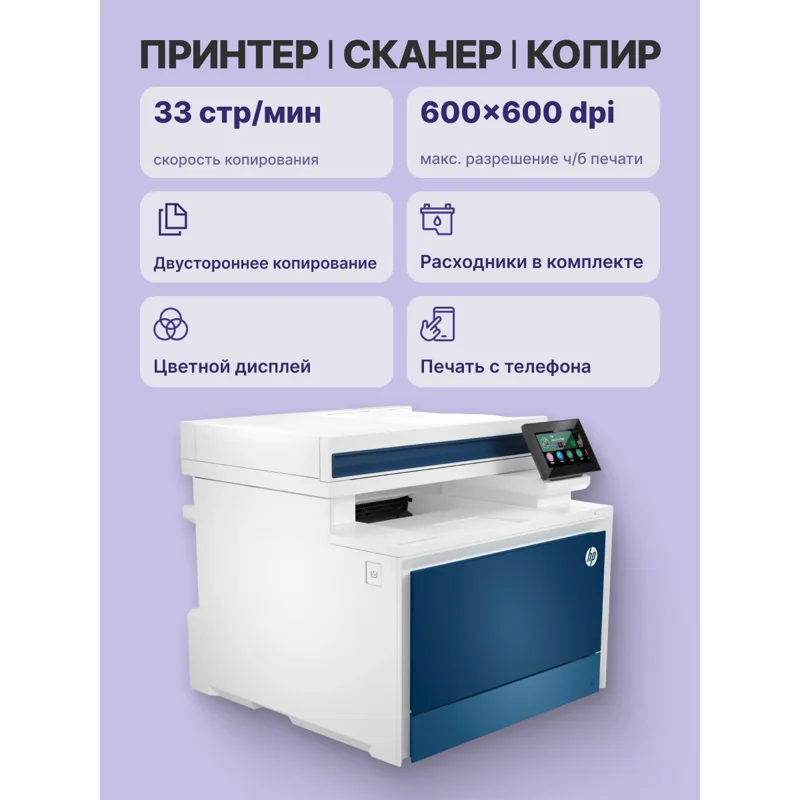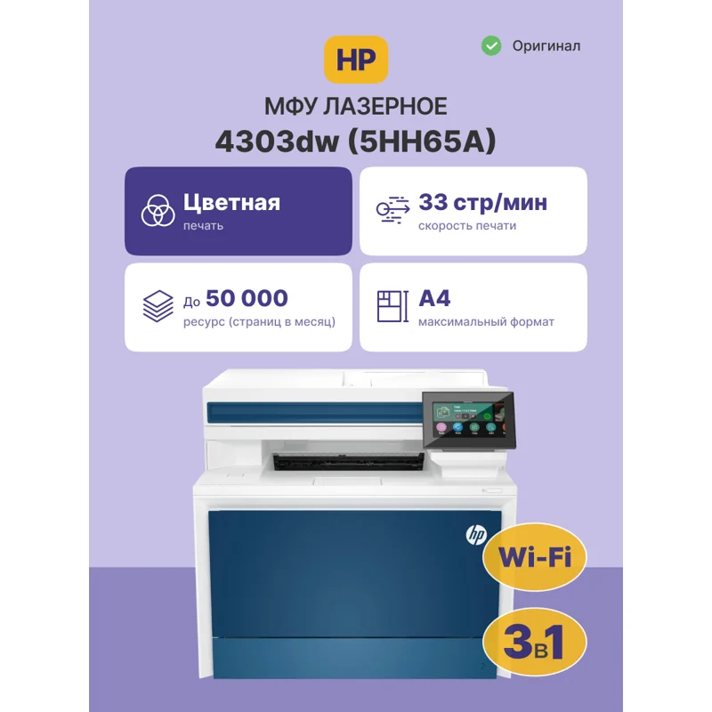 Лазерное многофункциональное устройство HP Color LaserJet Pro MFP 4303dw (p/c/s, A4,600 dpi,33(35)ppm,512Mb,2 trays 50+250,4.3'' touch display,Duplex, ADF50,USB/GigEth/WiFi/Bluetooth,4 cart.in box black 2000&cmy1000 pages, repl. W1A77A)