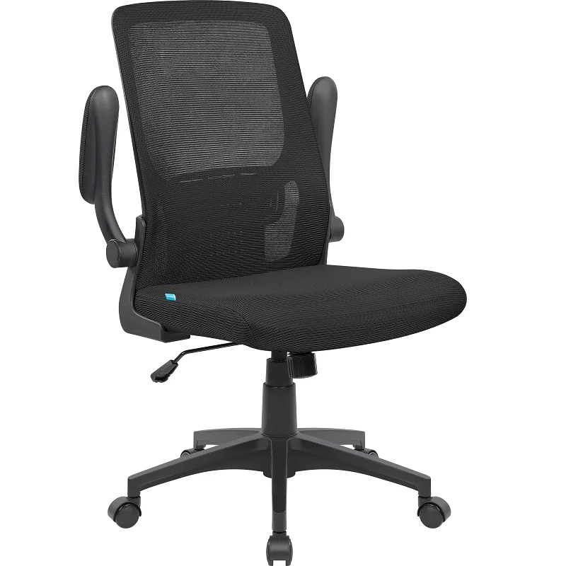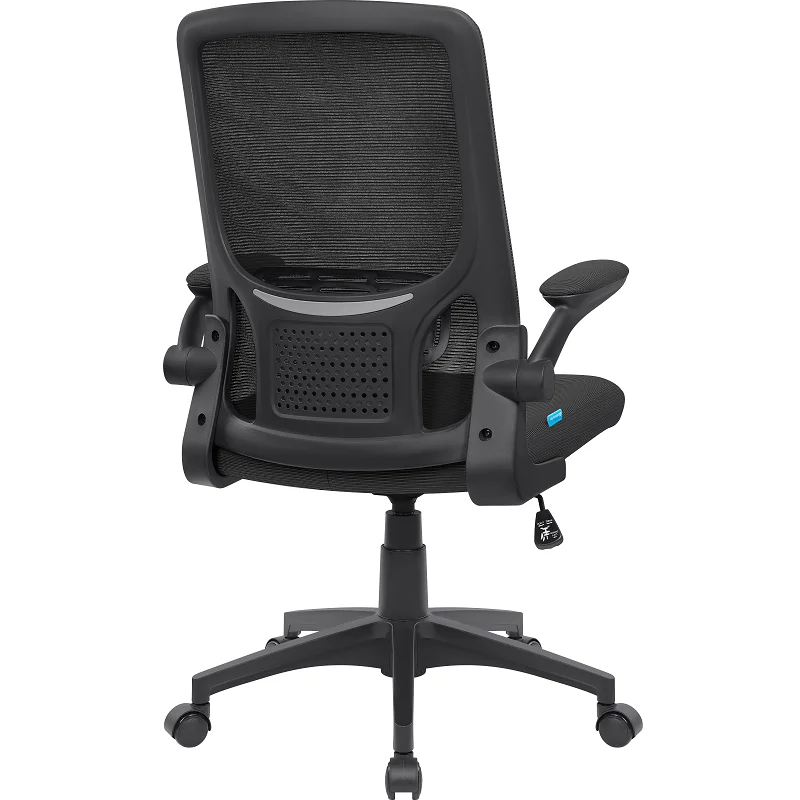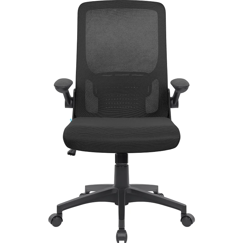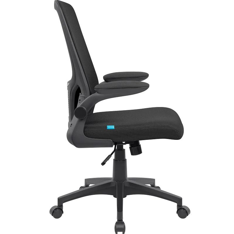 Удобное офисное кресло с мягкими подлокотниками, сетчатой спинкой и поясничным упором. Благодаря специальной конструкции подлокотники откидываются вверх. Кресло оборудовано механизмом качания.