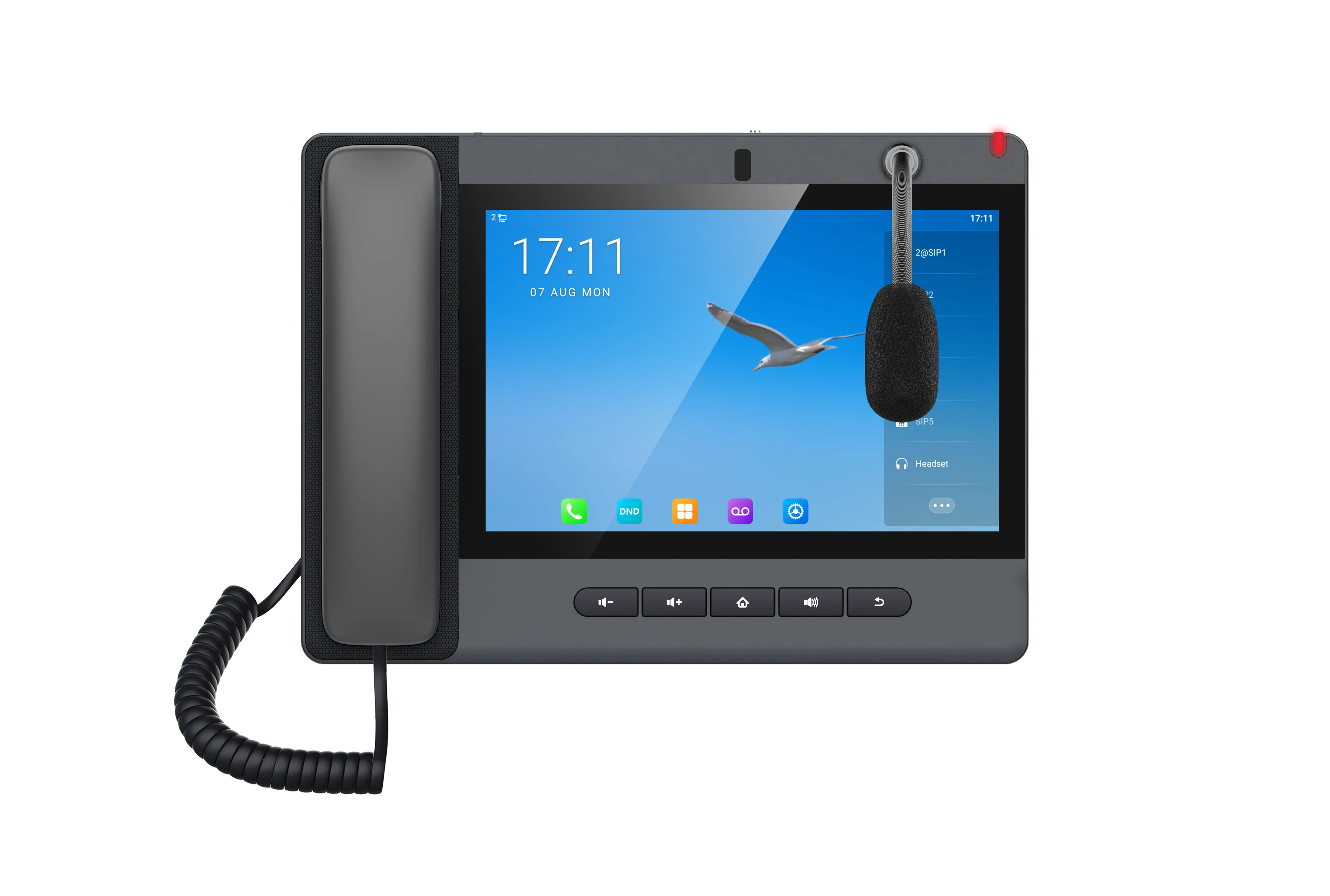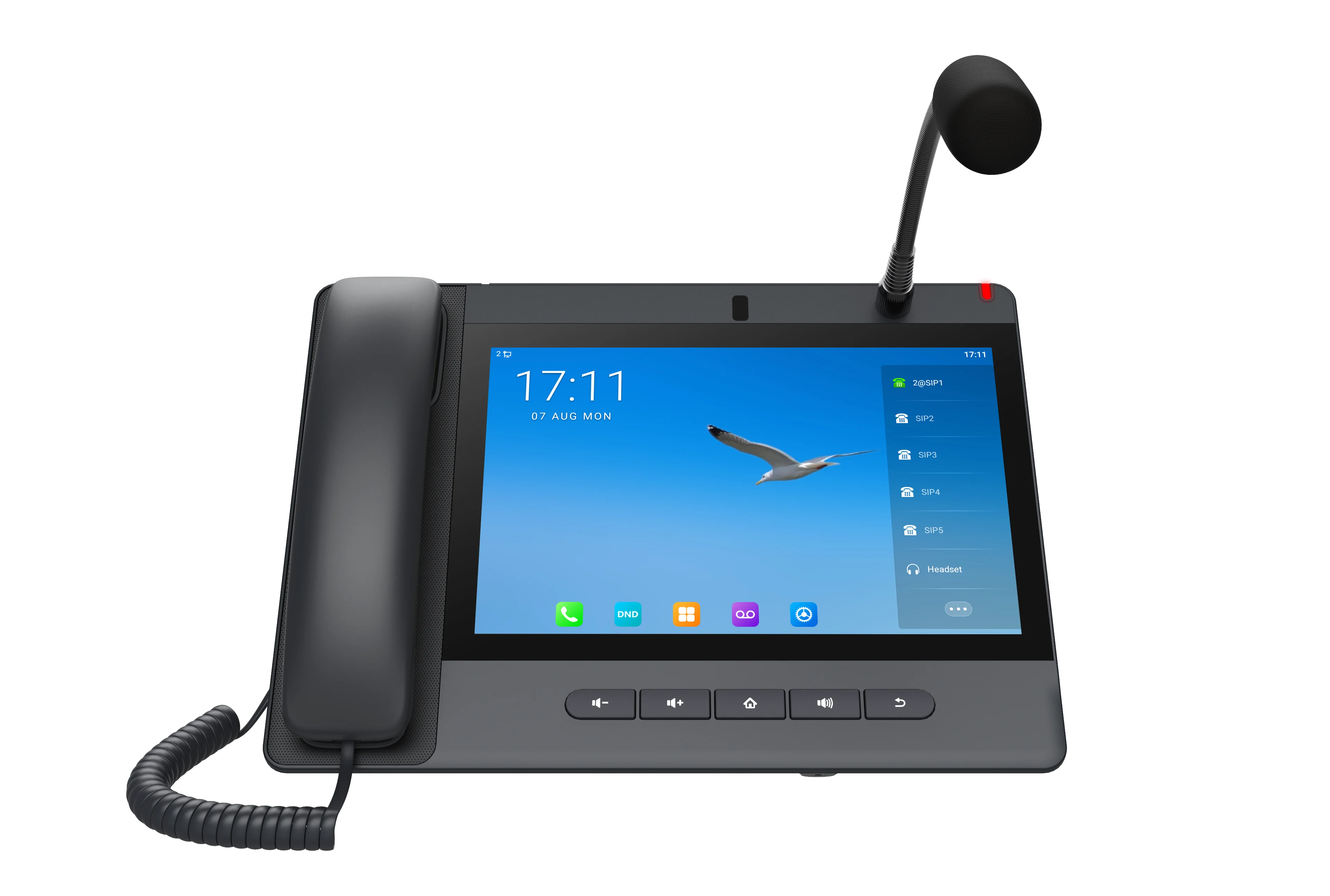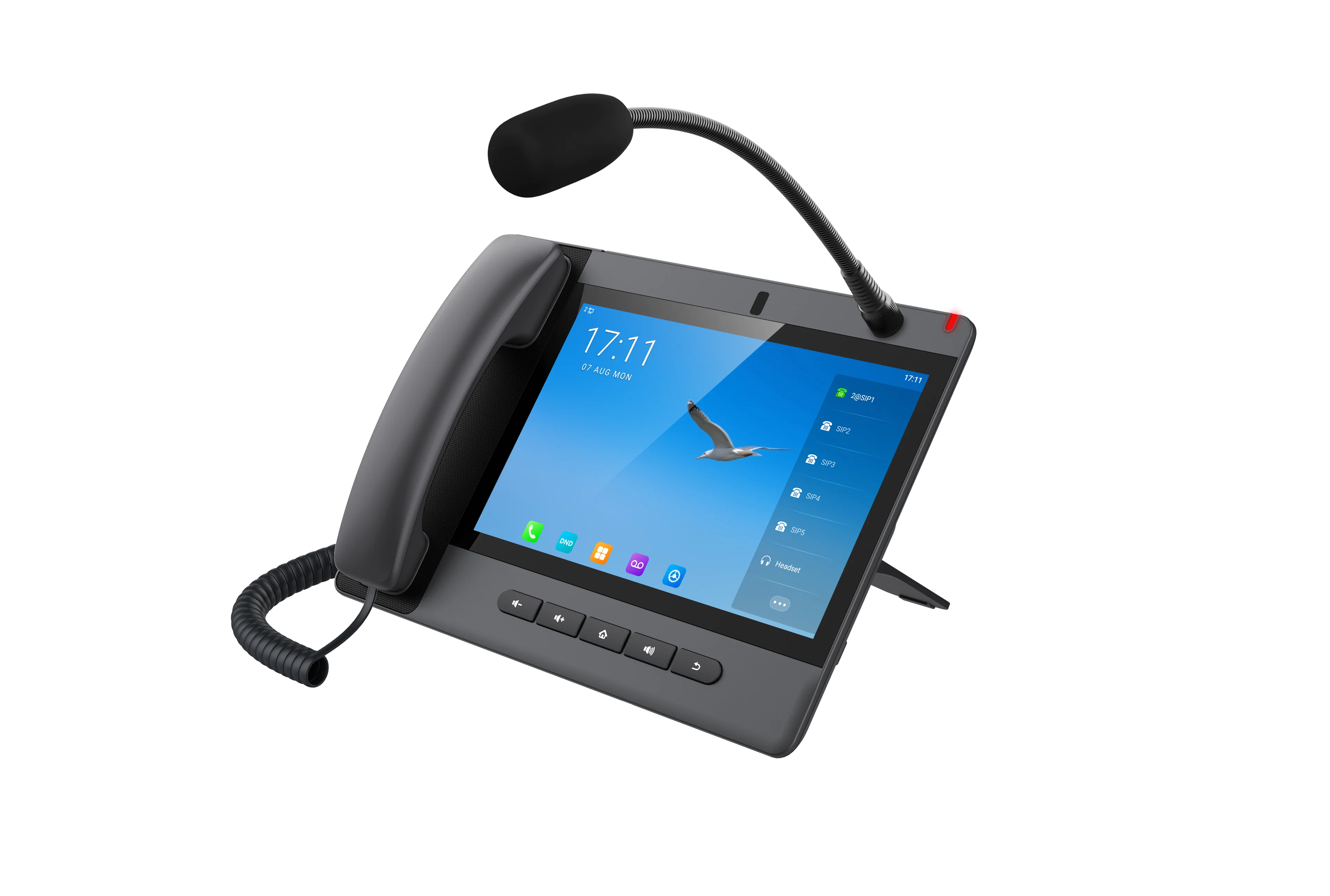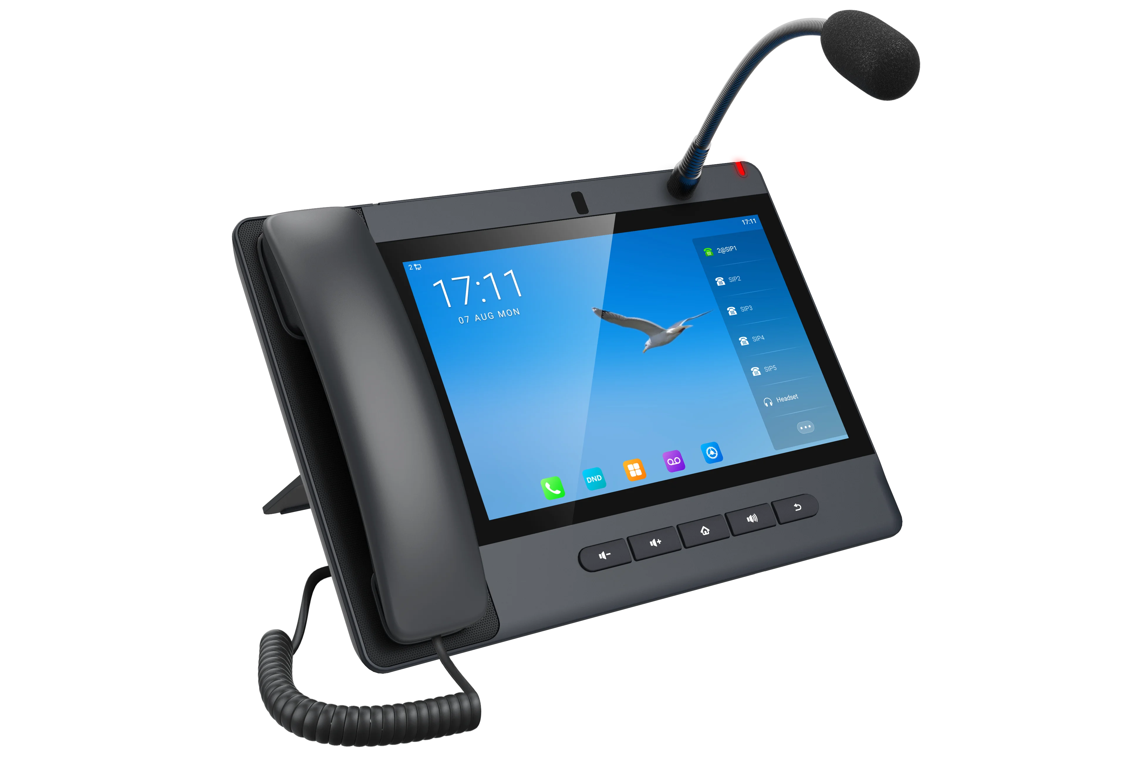 SIP-телефон A320i на ОС Android 9.0 со встроенной камерой функционирует не только как IP-телефон, но и как консоль мониторинга и оповещения. Обладает микрофоном "гусиная шея" и поддерживает HD-громкую связь, звонки на внешние и внутренние номера, двустороннюю связь с домофонами, режимы мониторинга и оповещения, улучшая эффективность управления и аварийного реагирования.