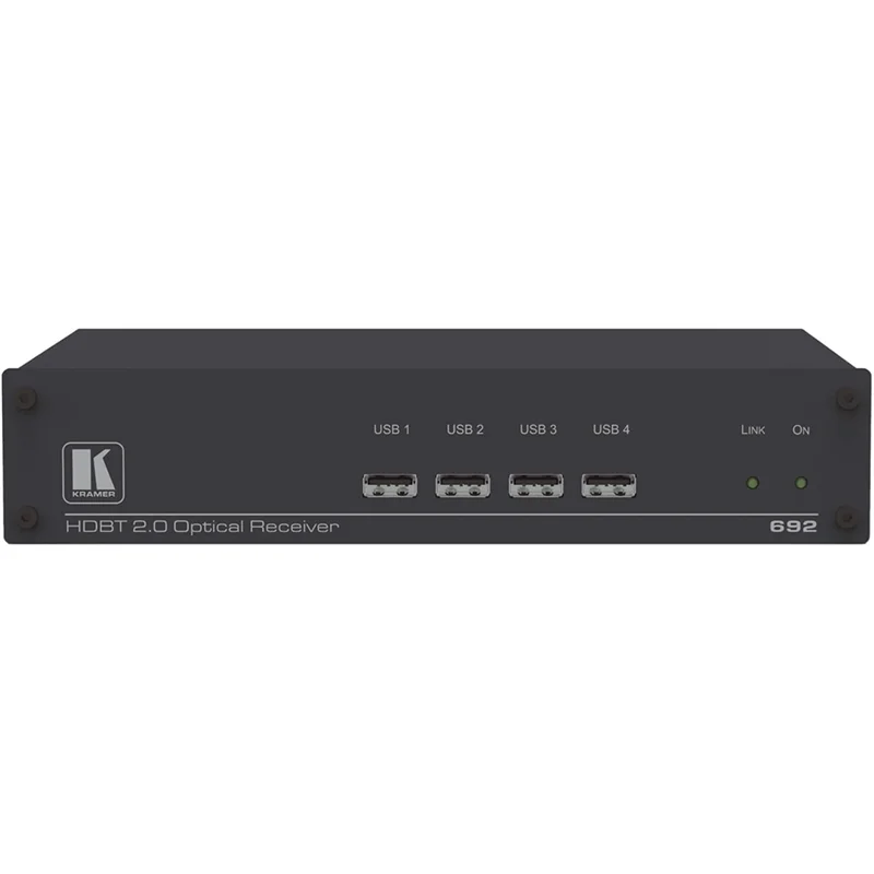 692 – приемник сигналов HDMI с разрешением до 4K/60 (YUV 4:2:0), небалансного стереоаудио, двунаправленных сигналов RS-232 и ИК, USB 2.0 и Ethernet по волоконно-оптическому кабелю. Для приема-передачи должны использоваться SFP-модули OSP-MM1 или OSP-SM10 в зависимости от выбранного кабеля и требуемой дальности передачи сигналов. Технология HDBaseT 2.0. Управление устройством осуществляется по RS-232 и IP (web-интерфейс и сеть Kramer).