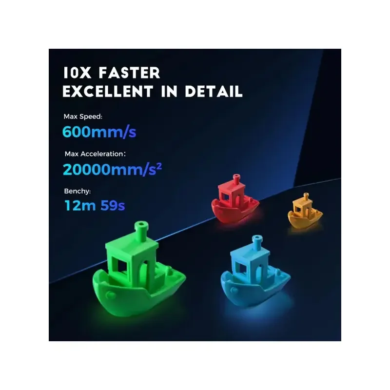 Впечатляющая максимальная скорость печати 600 мм/с и ускорение до 20 000 мм/с . Достижение скорости в 12 раз выше, чем у предыдущей модели SV06. Benchy занимает всего 12 мин 59 с , что значительно повышает общую эффективность производства.