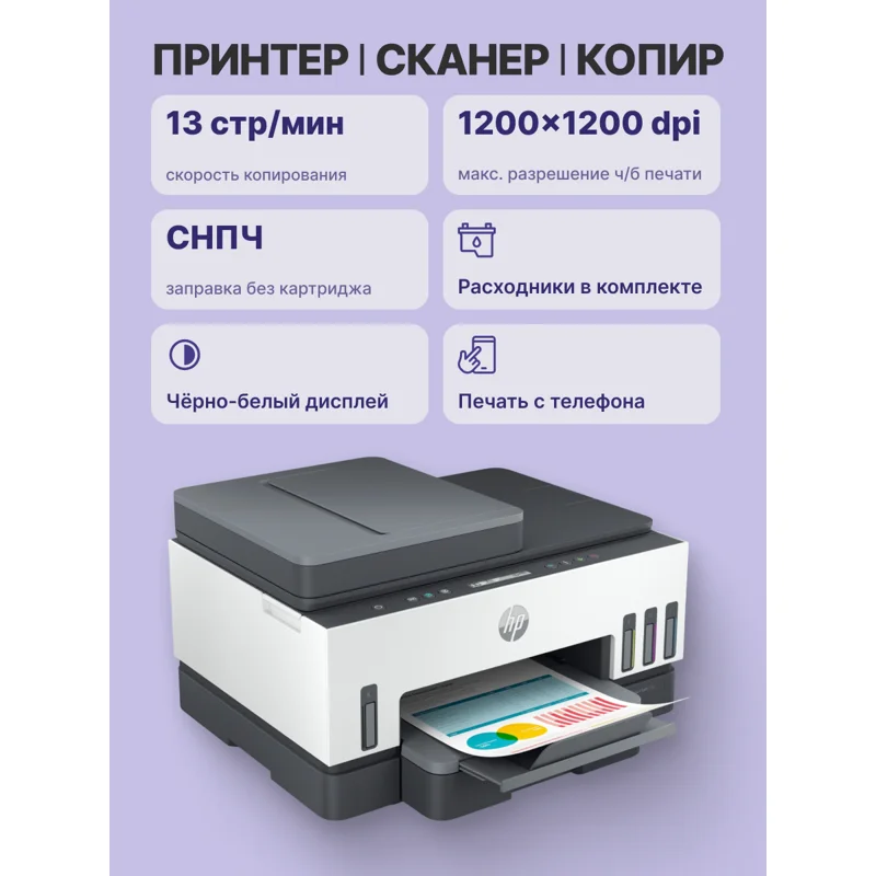 В комплект входят оригинальные чернила HP для печати до 18 000 черно-белых и до 8 000 цветных страниц. Ускорьте работу с многостраничными документами с помощью функции автоматической двусторонней печати. Быстрое и надежное подключение благодаря двухдиапазонному адаптеру Wi-Fi с функцией автовосстановления . Печатайте, сканируйте и копируйте с помощью телефона, где бы вы ни находились . Оцените расширенные возможности сканирования в течение 12 месяцев при использовании HP Smart Tank .