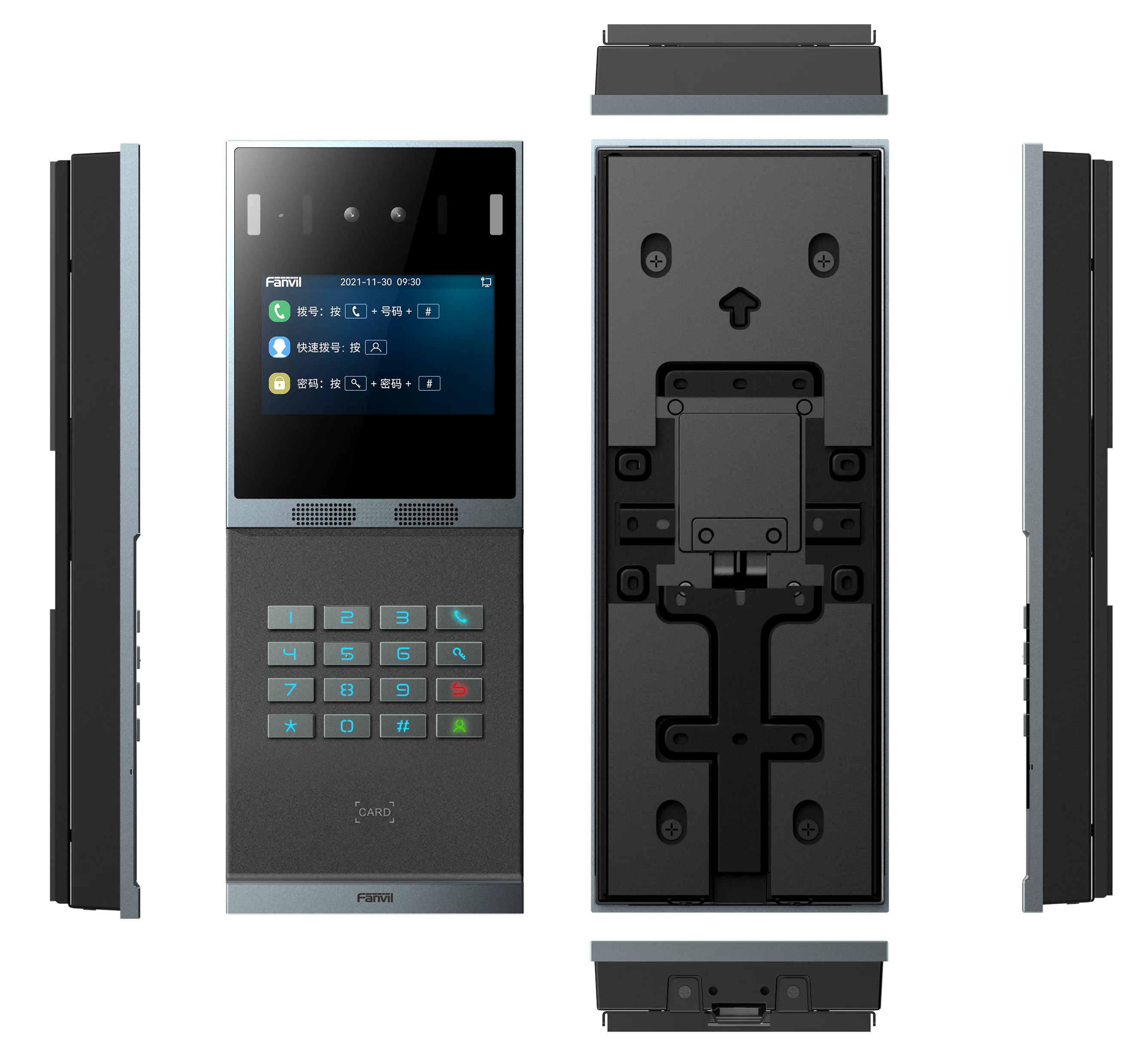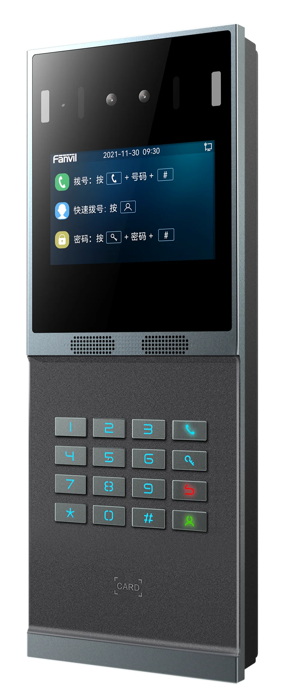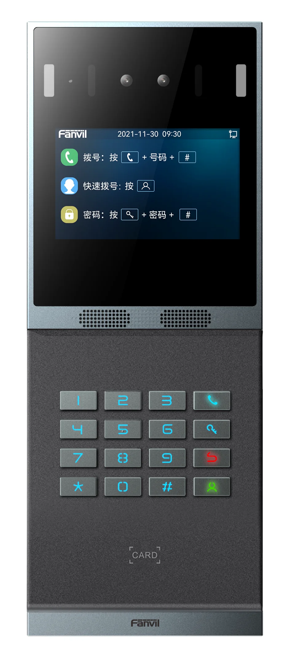 Fanvil i66 — это домофон в новом дизайне с распознаванием лиц, полной клавиатурой (16 клавиш), большим дисплеем, камерой 2 Мп и считывателем RFID. Конструкция изделия выполнена из цельноалюминиевого сплава со степенью ударопрочности IK07.
