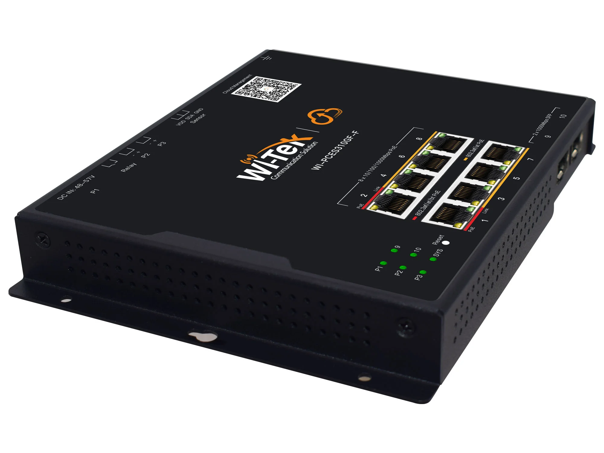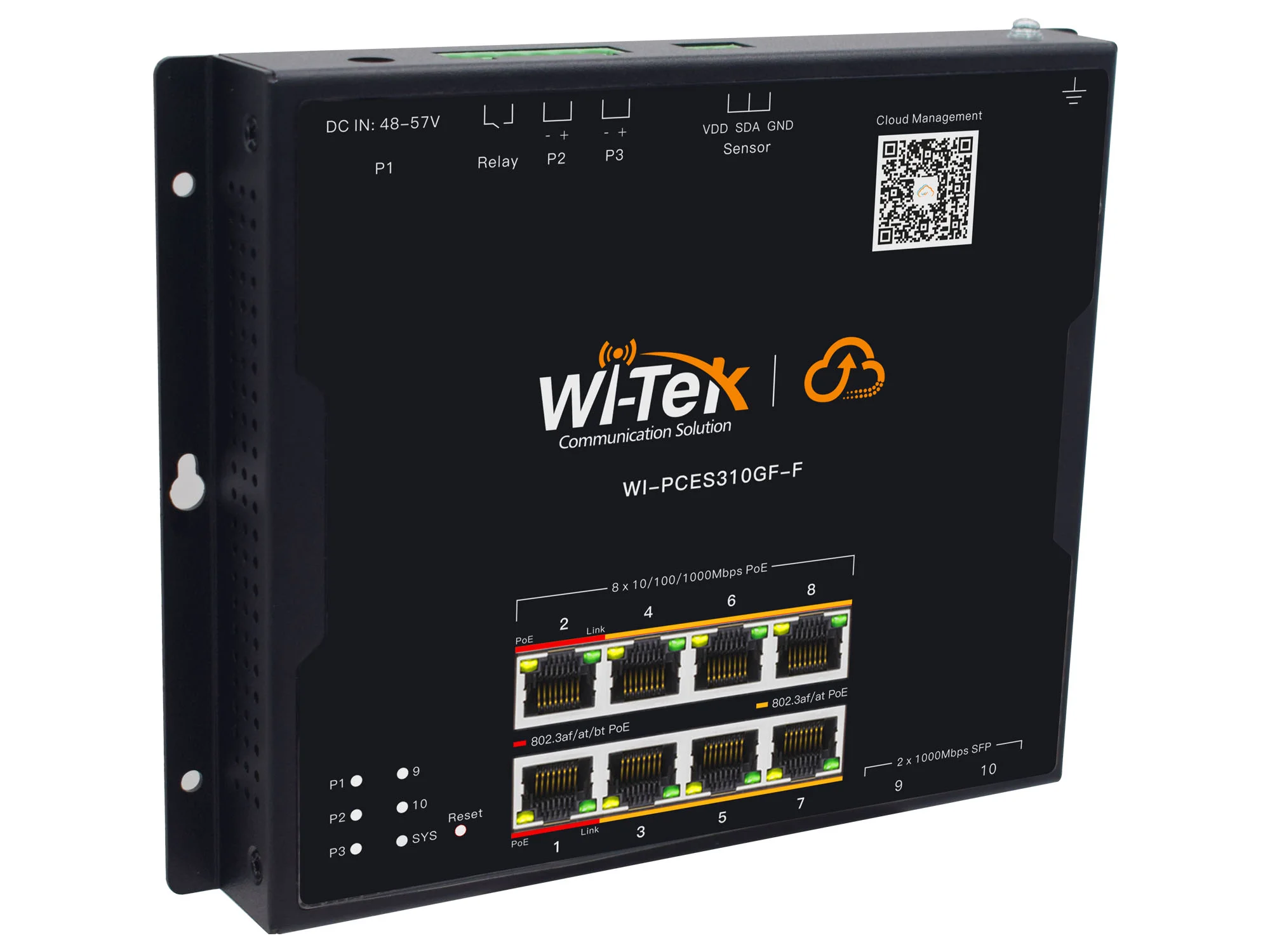 Промышленный плоскопанельный настраиваемый PoE-коммутатор Wi-Tek WI-PCES310GF-F серии Easy Smart оснащен 8 PoE-портами (6 стандарта 802.1af/at, 2 с поддержкой Hi-PoE, со скоростью 1000Base-T) и 2 портами SFP.