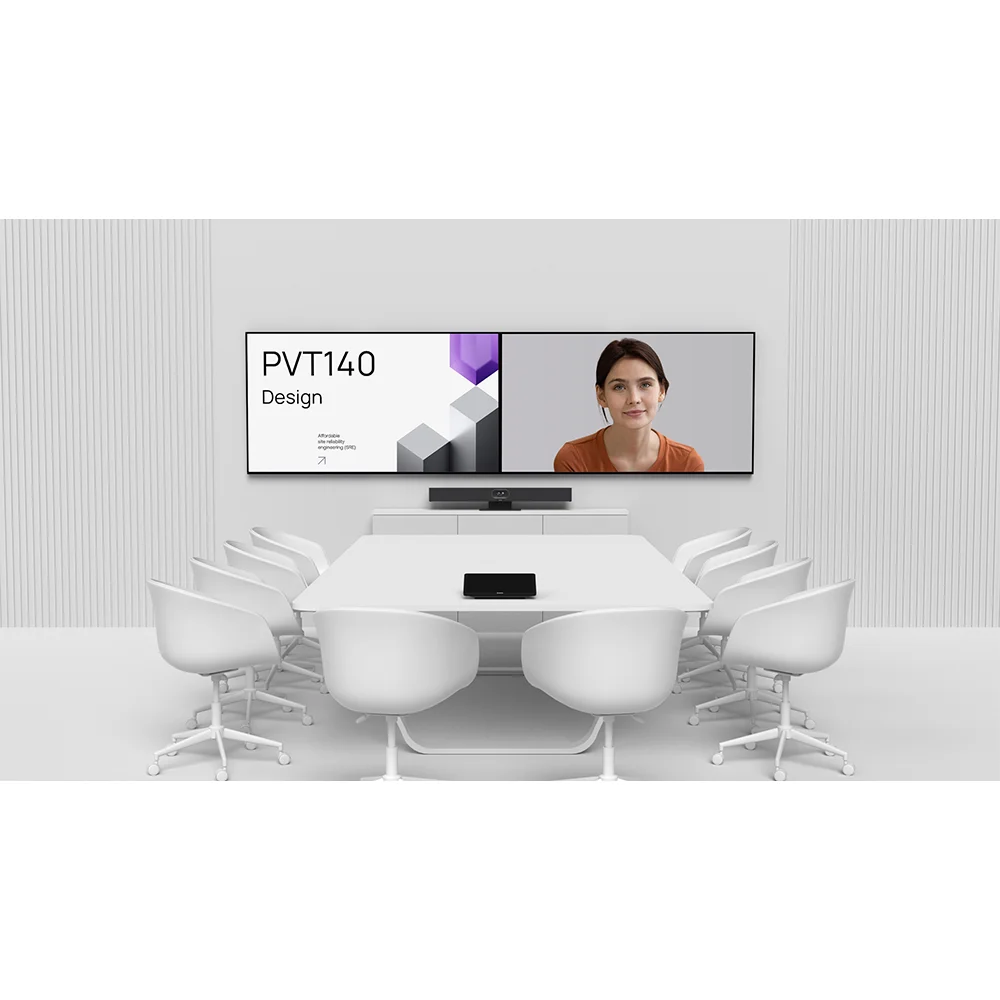Yealink PVT140-0010 - Видеотерминал "все-в-одном" для небольших и средних переговорных. Видеобар с встроенными двойной видеокамерой, саундбаром, массивом из 8 микрофонов комплектуется монтажным кронштейном и пультом управления. Для конференций по открытым протоколам SIP/H.323 или в режиме BYOD для коммуникационных приложений пользователя. Переключение между режимами осуществляется с сенсорной панели управления PTC25 (опционально в составе поставки), поддерживаются дополнительные микрофоны Yealink. Поддерживают режим BYOD проводной VCH51 или беспроводной WPP30 адаптеры подключения пользовательского устройства (опциональны в составе поставки). Поддерживается системой удаленного управления, диагностики и техподдержки YDMP.