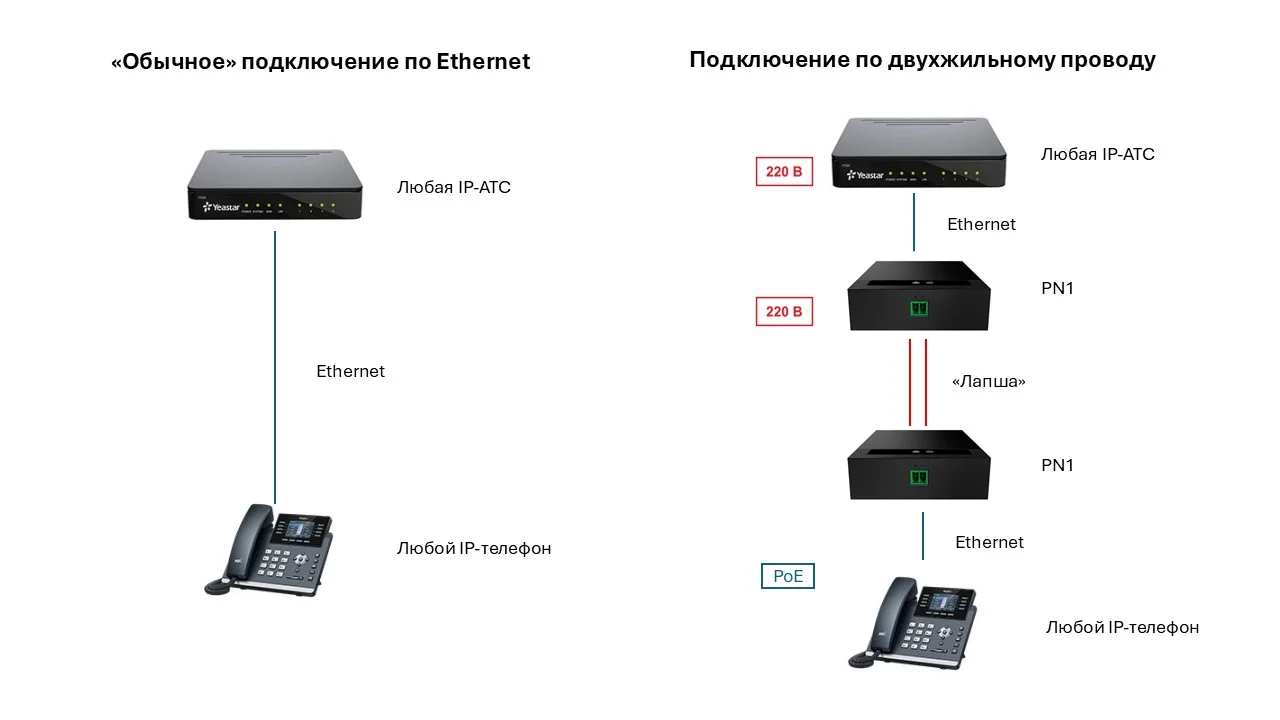 VoIP-шлюз Fanvil PN1 состоит из 2 частей: одна — со стороны телефона, другая — со стороны IP-АТС. Таким образом, любой IP-телефон можно подключить к любой IP-АТС по двужильному проводу ("лапше").