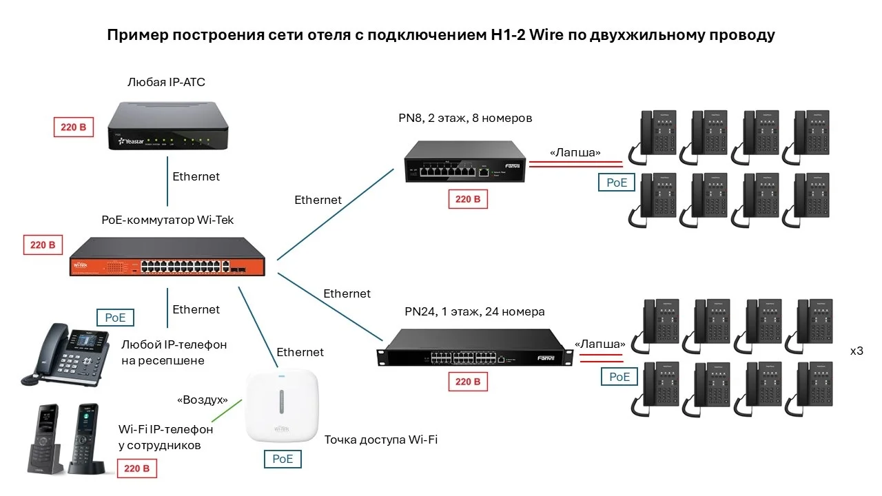 Fanvil PN8 — шлюз (коммутатор) для подключения к любой IP-АТС по 2-жильному проводу ("лапше") до 8 шт. специальных телефонов Fanvil. Представлены 2 модели специализированных телефонов для такого подключения — H1-2 Wire и X303-2 Wire.