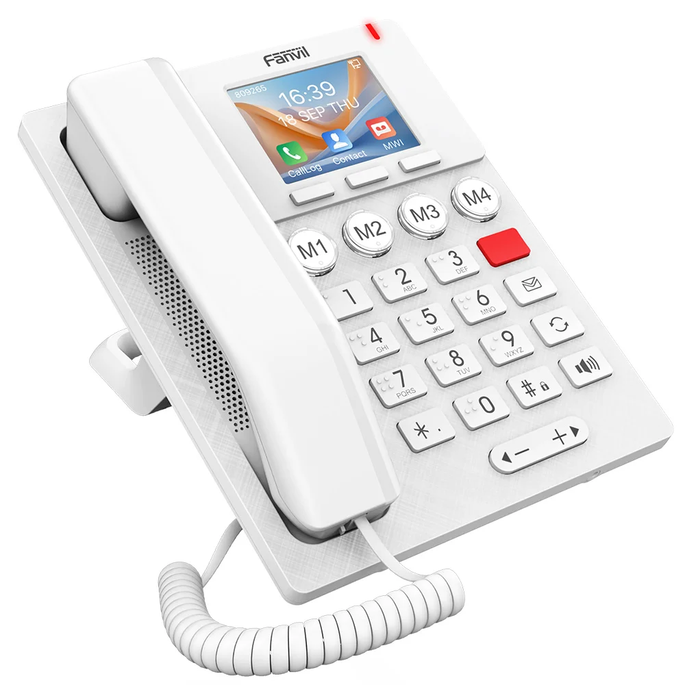 Fanvil X306 белого цвета — IP-телефон с большими кнопками, предназначенный для домов престарелых, больниц и домашнего использования. Аппарат оснащен 3,5'' цветным экраном и большими кнопками со шрифтом Брайля, поддерживает 2 линии SIP и питание по PoE для обеспечения удобства работы. Имеет встроенный Wi-Fi с частотой 2,4/5 ГГц и поддерживает беспроводные кнопки экстренной помощи с частотой 433 МГц, обеспечивая эффективную и высококачественную связь для пожилых людей. 4 программируемые клавиши кастомизируются по желанию заказчика для облегчения восприятия (например, фотографиями близких людей или медицинскими символами).