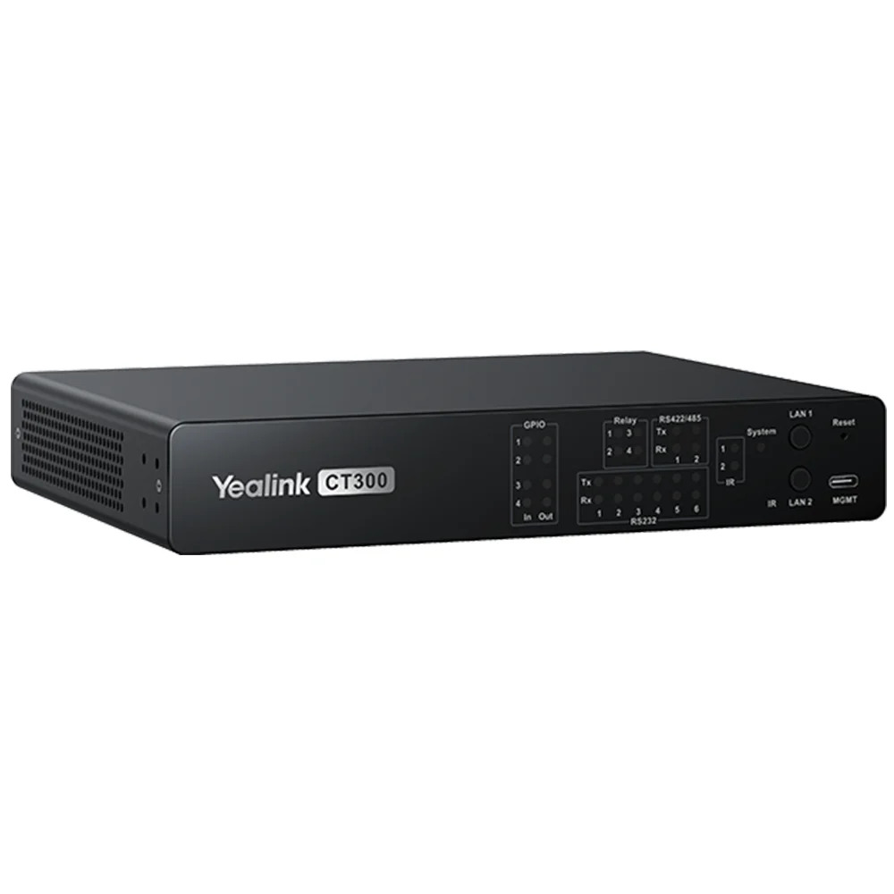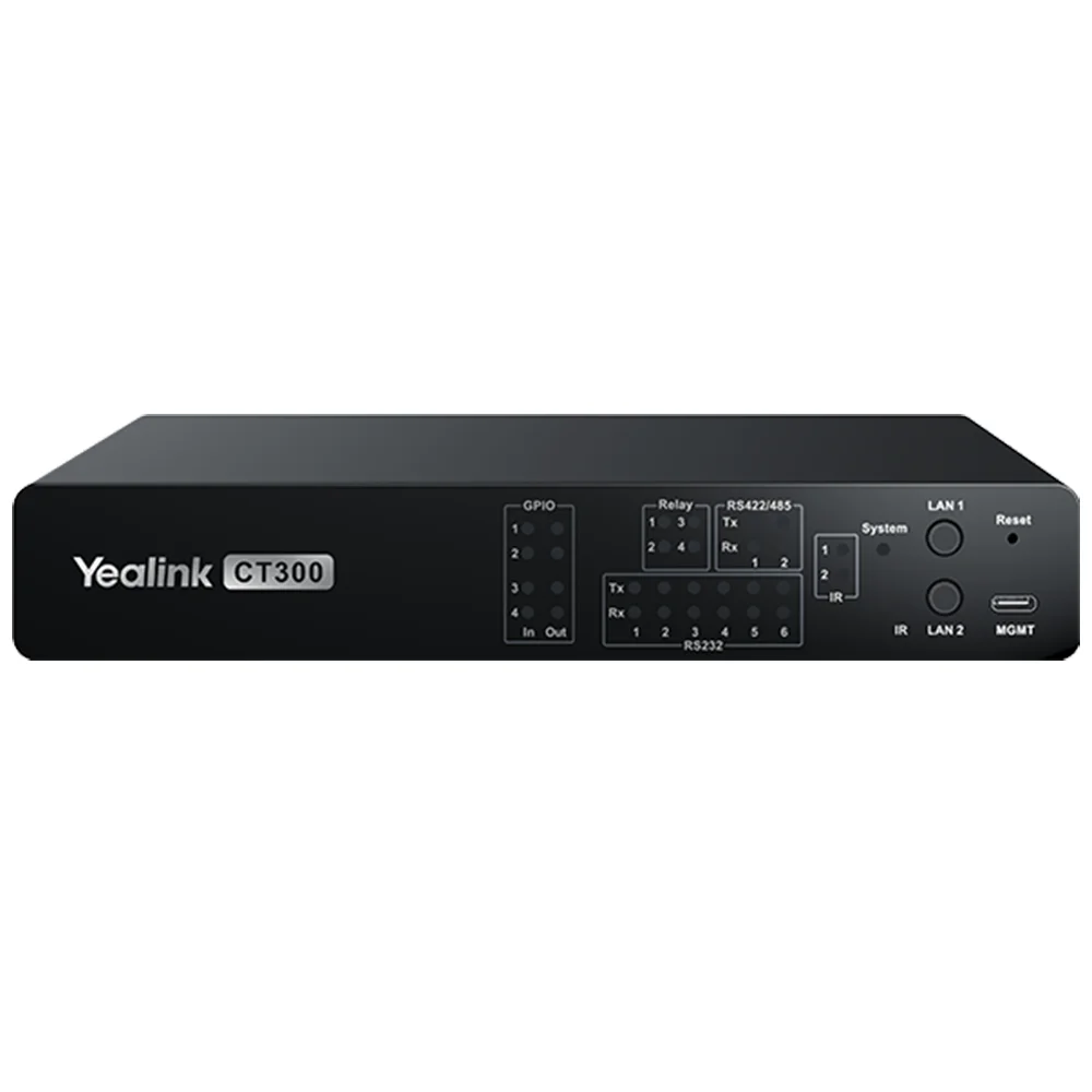 Контроллер системы управления Yealink CT300 используется для объединения и автоматизации комплексных решений в едином интерфейсе управления. ПО Room Designer, библиотека драйверов с возможностью удобной интеграции сторонних устройств делают администрирование, мониторинг и управление мультимедийными комплексами максимально гибким и эффективным. CT300 имеет широкий набор интерфейсов: RJ45, RS232, RS422/485, реле, GPIO, а также порты для передачи и приема сигналов по ИК, что открывает максимально широкие возможности для управления комплексами подсистем любой сложности.