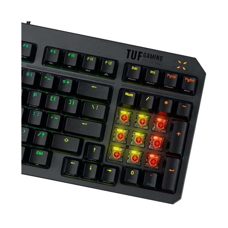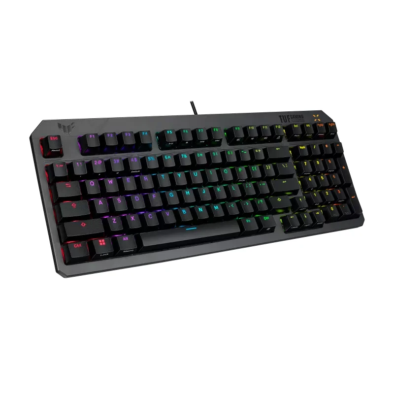97-клавишная раскладка клавиатуры ASUS TUF Gaming K3 Gen II обеспечивает компактность и портативность, что позволяет освободить больше места для руки, работающей с мышью. Задний слот для укладки кабелей способствует более аккуратному размещению клавиатуры на рабочем столе, что особенно важно для тех, кто ценит порядок и удобство.