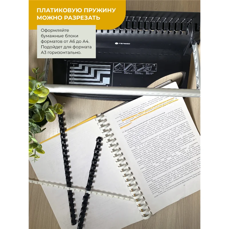 Пружины для переплета ГЕЛЕОС, которые можно использовать для скрепления любых документов формата А4 или А3 по короткой стороне, а так же меньших форматов. Благодаря плоскому расположению документа на пружинах, вы можете легко делать заметки и снимать копии. Пружины изготовлены из качественного и прочного материала, и не будут царапать или затирать документы. В коробке 2 цвета - черный и белый. Размер 19 мм. В упаковке 50 шт. - 25 белых, 25 черных. Пружины для брошюратора помогут вам создать стильные и аккуратные документы. Пластиковая пружина для переплета - это один из способов связывания страниц документа вместе. Она используется для создания книг или блокнотов, альбомов, отчетов, презентаций и других типов документов, которые требуют привлекательного и функционального внешнего вида. Дипломные проекты, школьные тетради, офисные календари будут иметь эстетический, защищенный и оригинальный вид. Данная канцелярия пригодится в офисе, школе, любой организации и дома для творческих и профессианальных работ.
