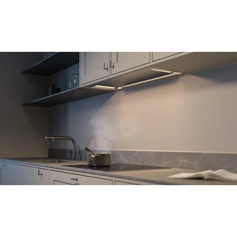 Имеет 5 уровней мощности и режим Boost для интенсивного удаления пара и запахов. Технология периметрического всасывания захватывает воздух по краям панели, повышая эффективность улавливания испарений и снижая уровень шума.