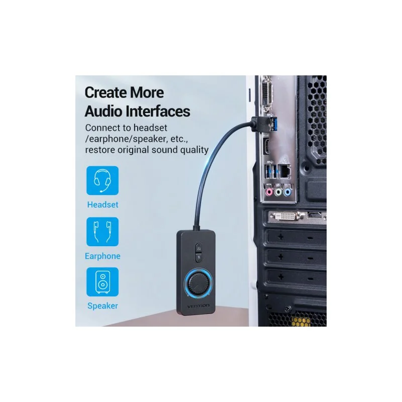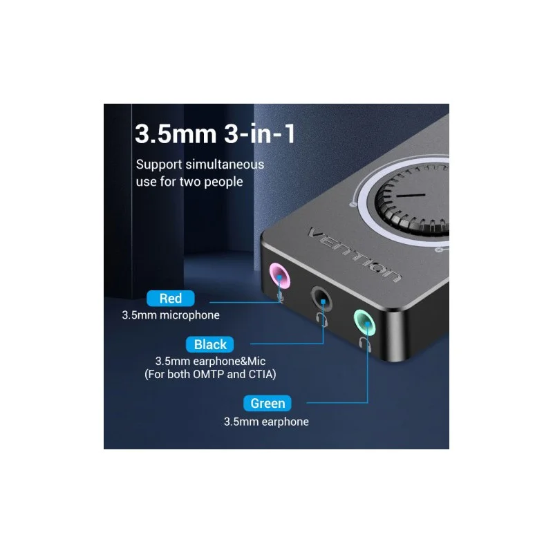Внешняя звуковая карта Vention CDRBB предназначена для конвертации сигнала USB в аналоговые стереозвуковые сигналы между аудио, аудио-видео и (или) компьютерными устройствами или их компонентами. Оснащена регулятором громкости, а также кнопками включения и отключения микрофона и звука.
