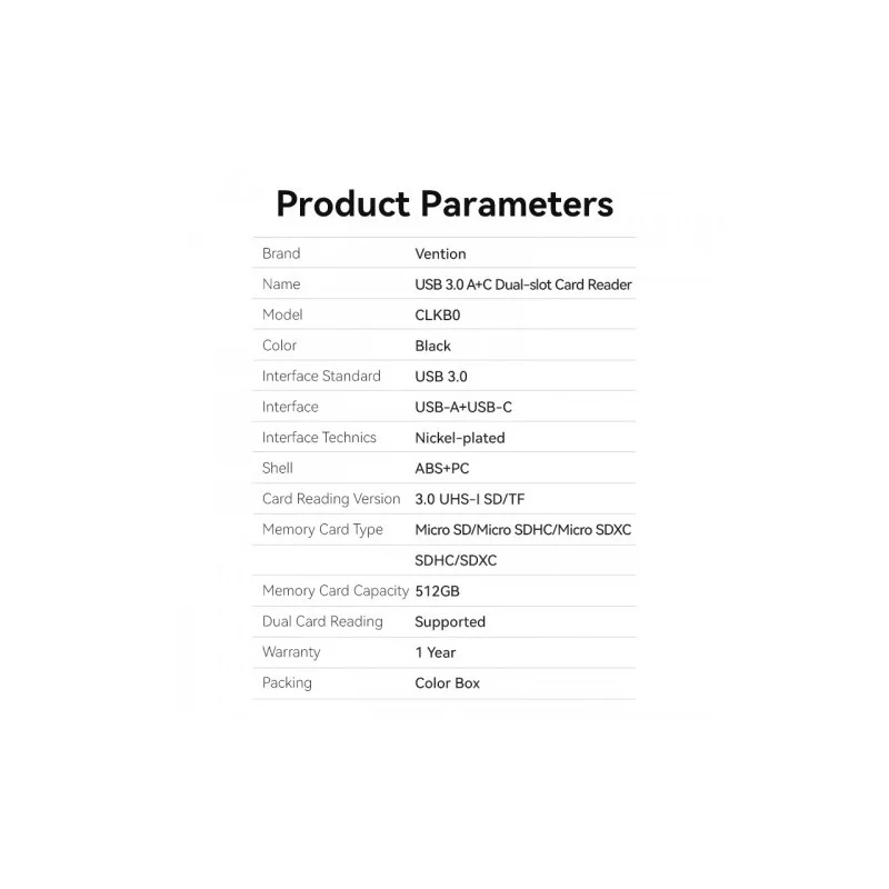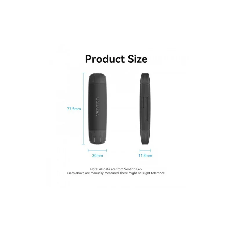 OTG Картридер Vention CLKB0 предназначен для считывания и передачи данных с карт памяти на оборудование с разъемом USB. Максимальный объем считывания до 512 Гб. Незаменим при подключении карт памяти к ноутбуку, компьютеру или прочему оборудованию.