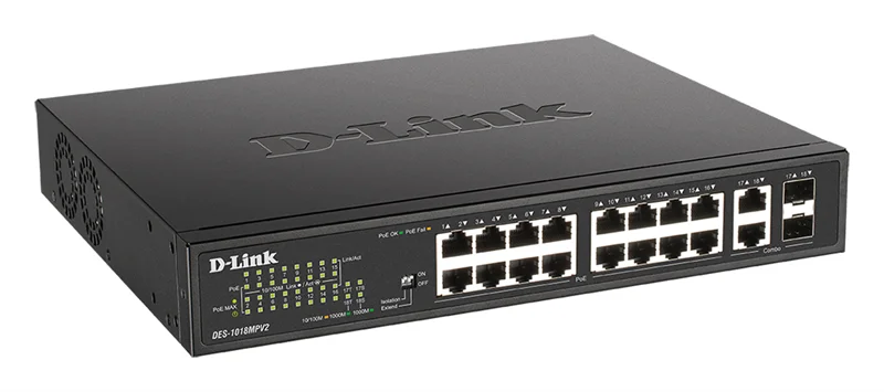 Коммутатор D-Link Unmanaged Switch 16x100Base-TX PoE, 2xCombo 1000Base-T/SFP, PoE Budget 247W, Long-range PoE up to 250m, metal case
