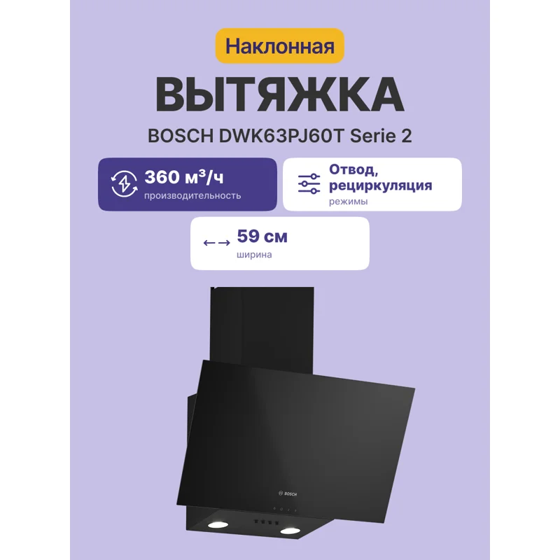 Вытяжка BOSCH DWK63PJ60T отличается стильным исполнением в чёрном цвете. Наклонная конструкция шириной 60 см гармонично впишется в любой кухонный интерьер, не занимая много пространства. Корпус выполнен из качественных материалов, устойчивых к воздействию высоких температур.