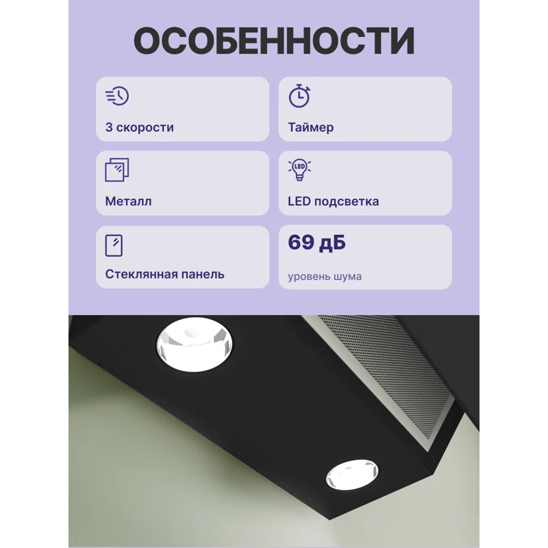 Энергоэффективные LED-лампы обеспечивают яркое и приятное освещение рабочей зоны, снижая нагрузку на глаза. Черный стеклянный корпус с наклонной конструкцией придает вытяжке современный и стильный вид.