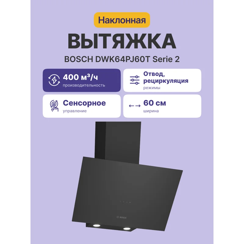Bosch DWK64PJ60T — это элегантная наклонная вытяжка, которая сочетает в себе мощную систему очистки воздуха, стильный дизайн и удобное управление. Благодаря высокой производительности и продуманной конструкции, она эффективно устраняет запахи, пары и жир во время готовки, делая кухню чистым и комфортным пространством.