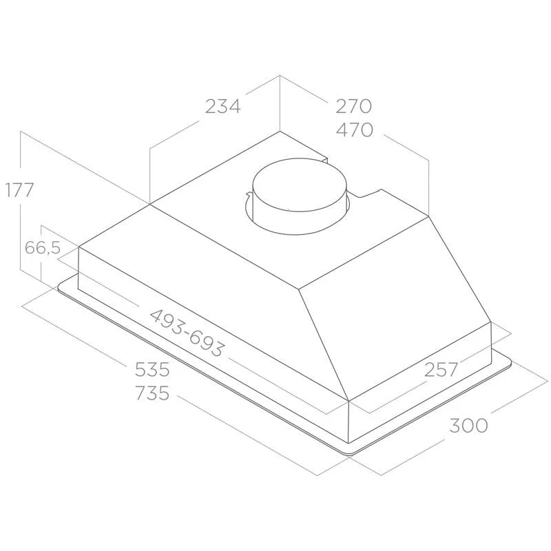 Вытяжка шириной 73 см легко встраивается в стандартные кухонные шкафы, что делает её подходящей для большинства кухонных гарнитуров. Возможность выбора между режимами отвода (подключение к вентиляционной шахте) и рециркуляции (очистка воздуха через угольные фильтры) позволяет адаптировать установку под любые условия помещения. Просторная рабочая зона обеспечивает эффективное удаление пара и запахов даже при использовании широких плит.