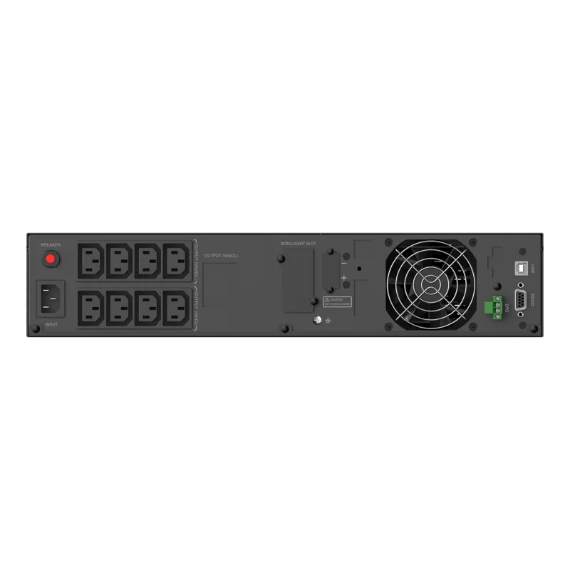 ИБП оснащен 8 выходными розетками IEC C13 и стандартным входным разъёмом IEC C14, что позволяет подключать сразу несколько устройств. Интерфейсы HID-USB, RS232, слот для SNMP и функция EPO обеспечивают удобное управление и удалённый мониторинг.