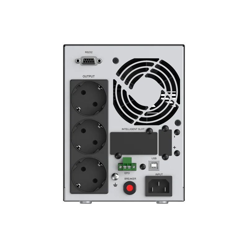 ИБП оснащен тремя розетками Schuko и стандартным входным разъёмом IEC C14, что позволяет подключать сразу несколько устройств. Интерфейсы HID-USB, RS232, слот для SNMP и функция EPO обеспечивают гибкое управление и удалённый мониторинг.