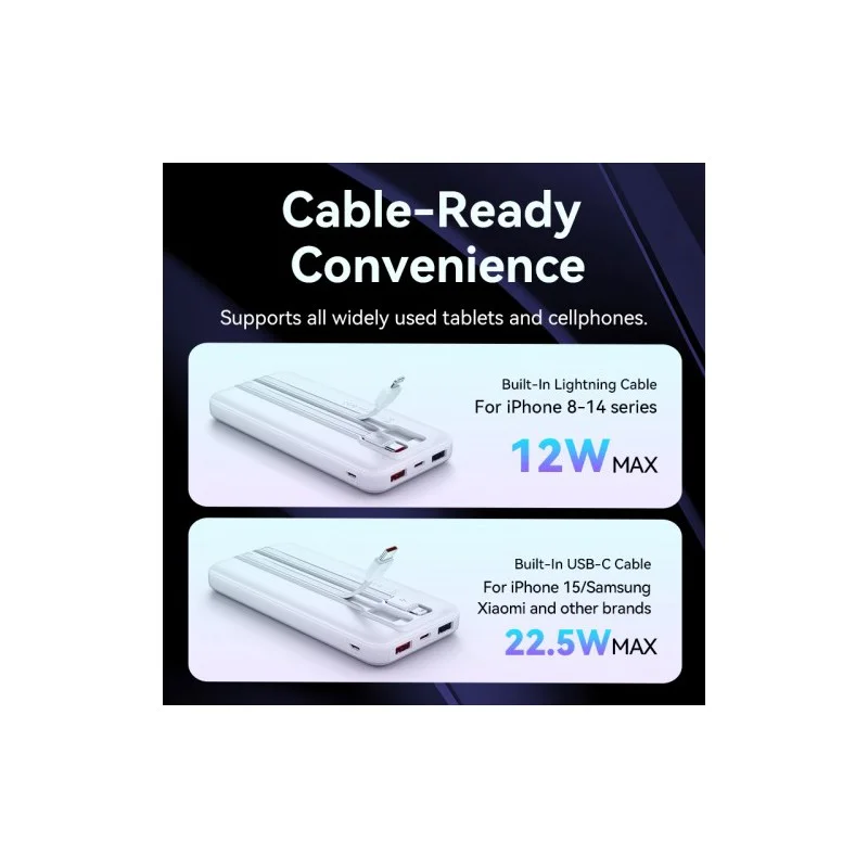 Модель оснащена встроенными кабелями Micro-USB, USB-C и двойным USB-A, что позволяет заряжать сразу несколько устройств без необходимости носить дополнительные шнуры. Это делает Power Bank универсальным решением для смартфонов, планшетов и других гаджетов.